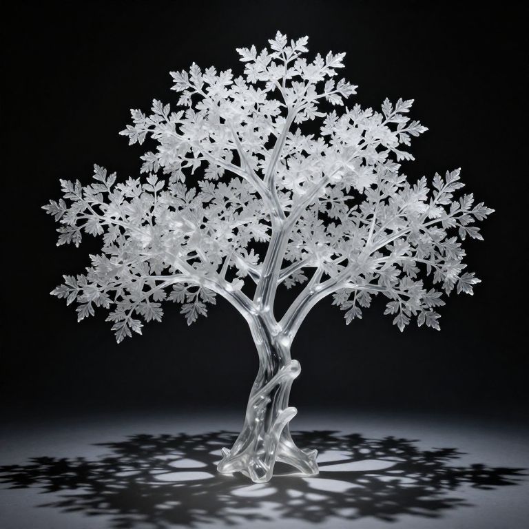 Ethereal glass tree stands gracefully, its translucent branches adorned with delicate crystalline leaves that shimmer against a dark backdrop, casting intricate shadows below.