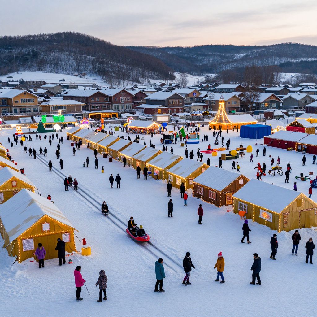 A panoramic view of a winter festival featuring toboggan tracks, tents decorated with lights, children and families enjoying snow activities, snowy village backdrop under a dusk sky, vibrant and festive ambiance, detailed and lively