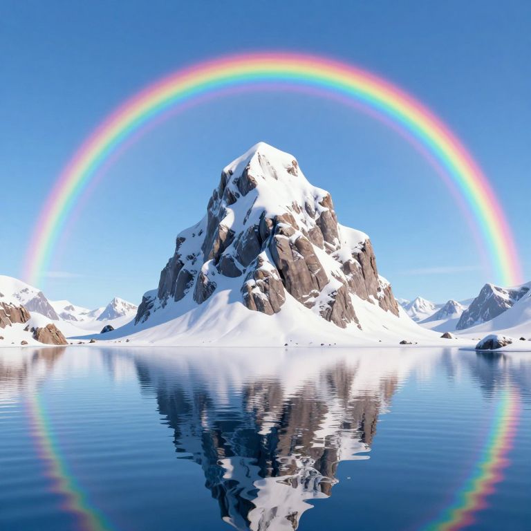 A serene 3D-rendered landscape features a towering, snow-capped rock formation mirrored perfectly in a tranquil lake, with a vibrant rainbow arching across a vivid blue sky, creating a dreamlike, high-definition scene where light and reflection blend seamlessly.