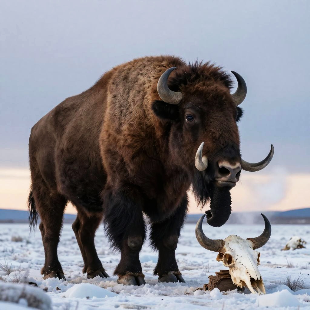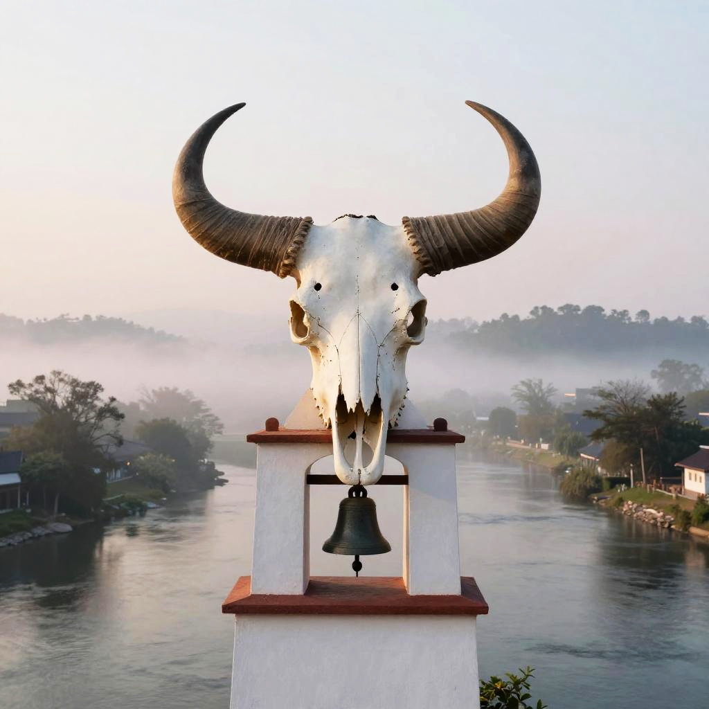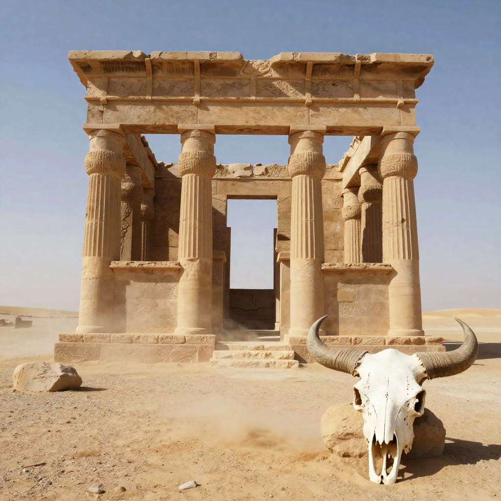 A simplified forgotten desert temple, sun-scorched plateau at noon, historical realism, eroded sandstone pillars, wandering dust devils, dramatic lighting, realistic bison bull skull.