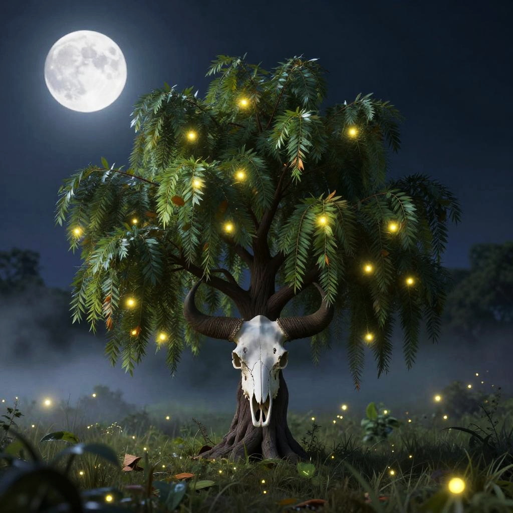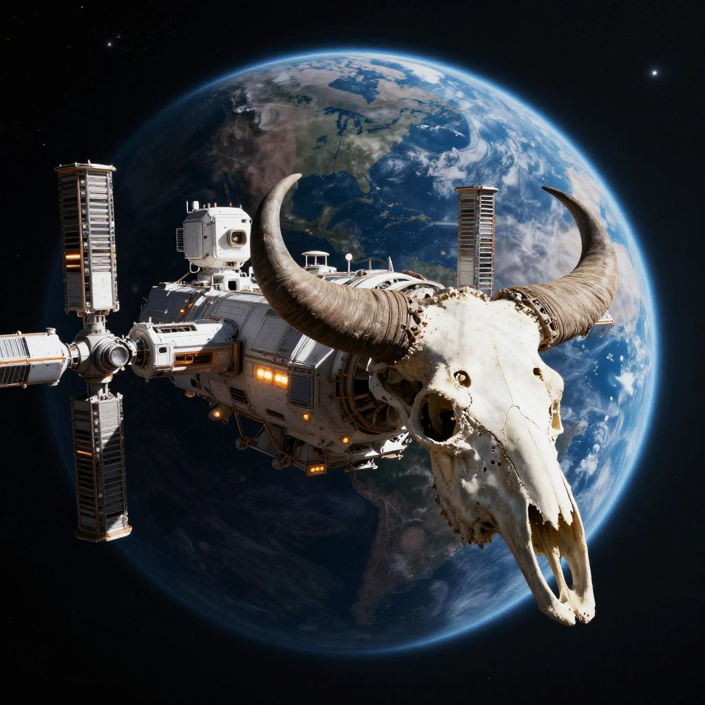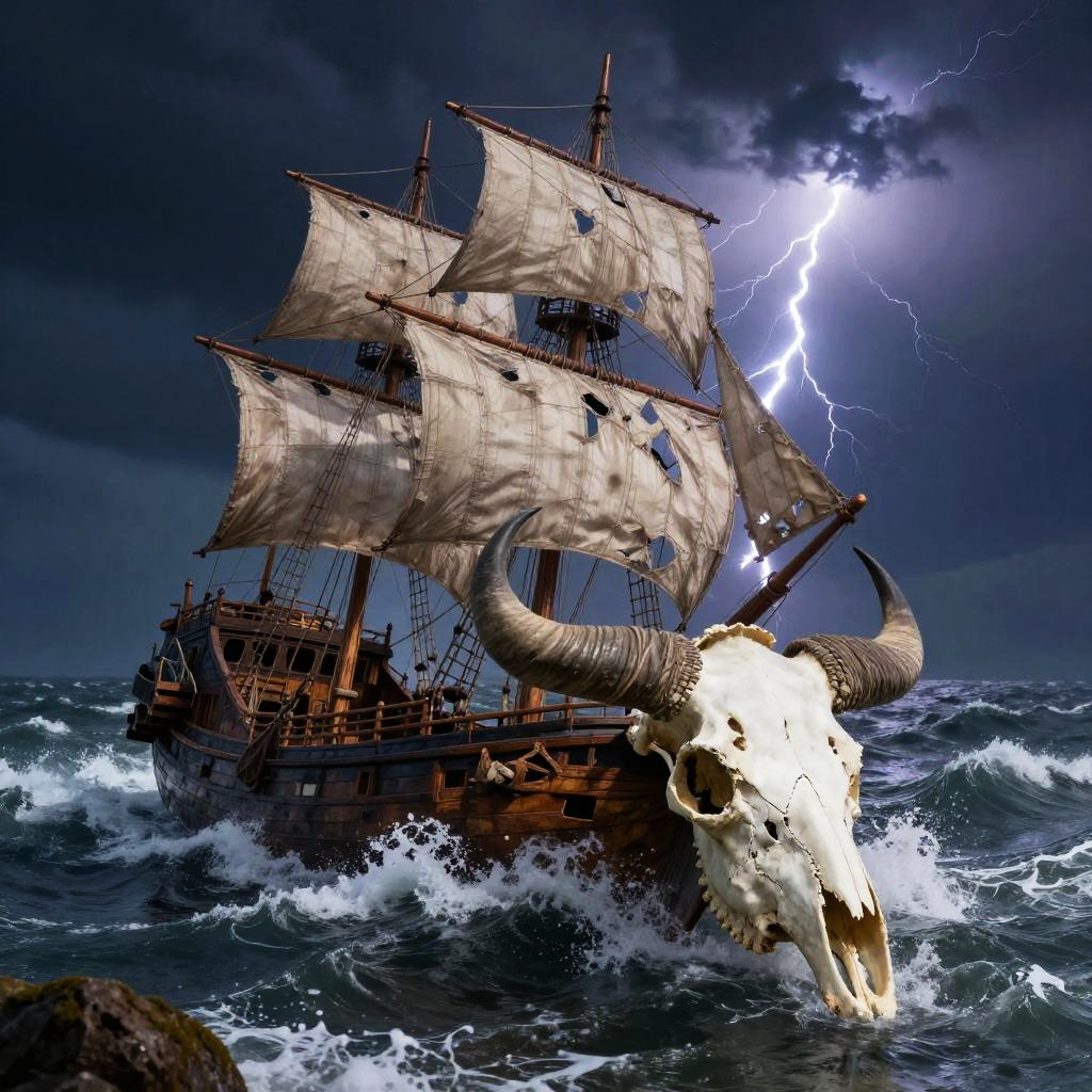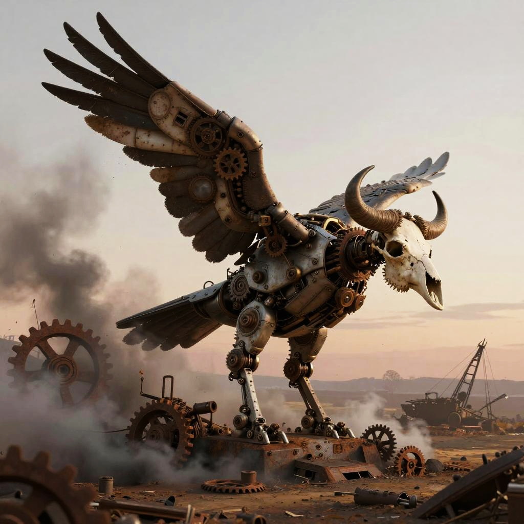 A simplified forgotten desert temple, sun-scorched plateau at noon, historical realism, eroded sandstone pillars, wandering dust devils, dramatic lighting, realistic bison bull skull.