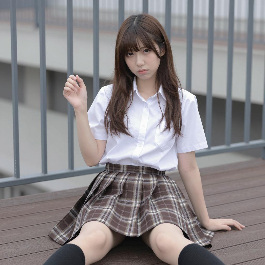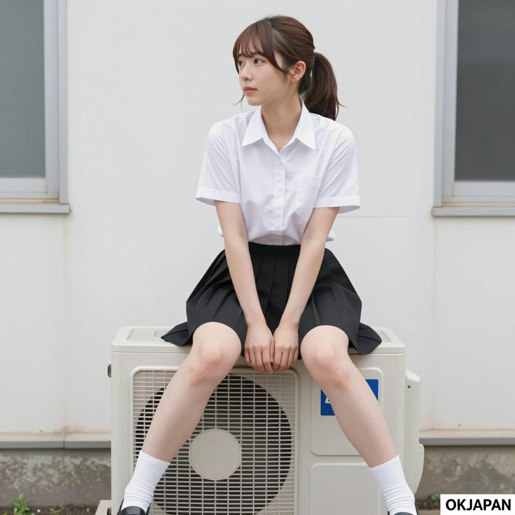 Japanese woman with light skin, brown hair in a side ponytail, wearing a white short-sleeve shirt, black skirt, white socks, and black shoes, sits on top of an air conditioning unit. Her legs are spread apart, hands resting on her knees. She looks to the left with a neutral expression. Background includes white building walls. "OKJAPAN" in the bottom right corner.