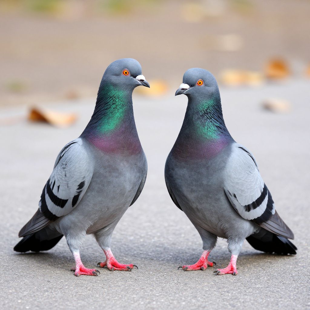 Two elegant pigeons stand side by side on a paved surface, their iridescent green necks contrasting with their gray bodies and vibrant red feet, as they face each other amidst a blurred backdrop of autumn leaves and soft natural light.