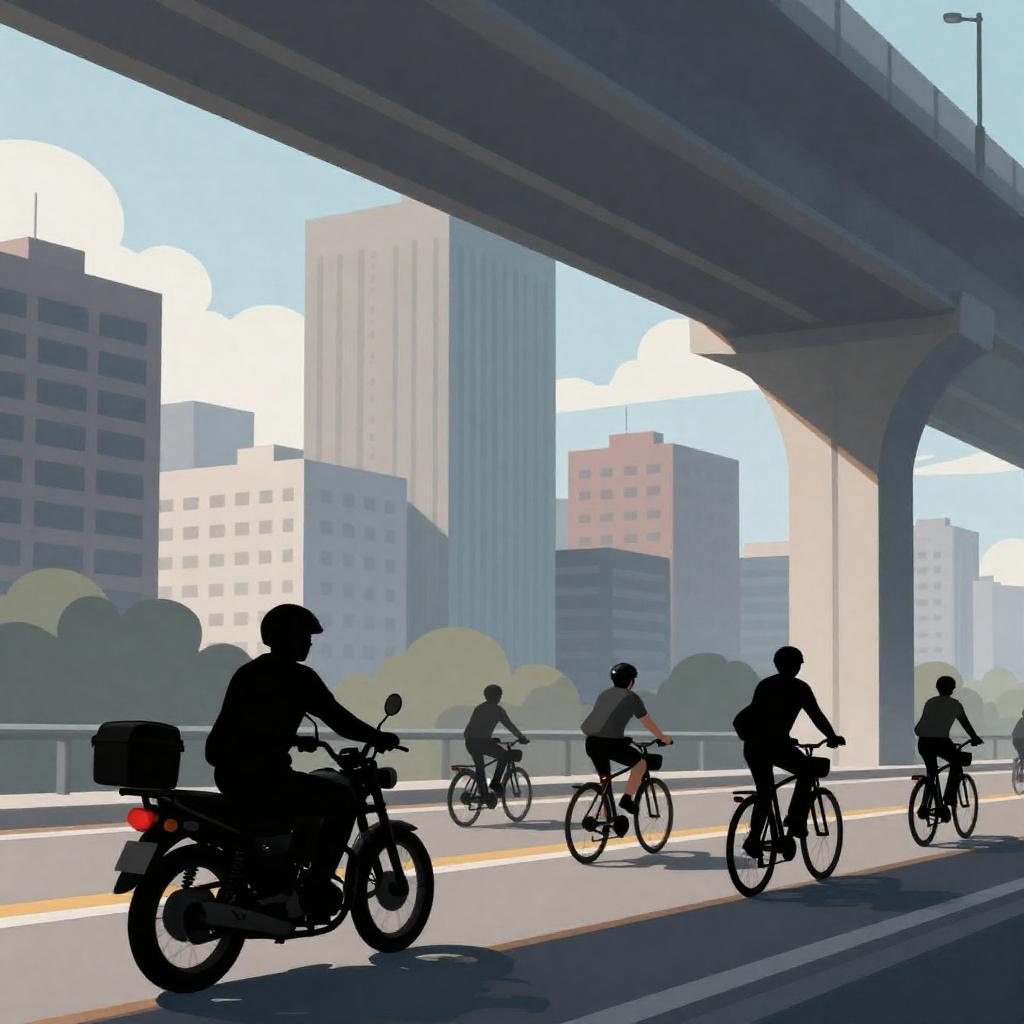 Digital illustration of a cityscape under a large overpass. Silhouetted figure riding a motorcycle in the foreground, several cyclists behind. Tall buildings in the background, sunlight casting shadows. Blue sky with scattered clouds. Multiple cyclists, one prominent rider.