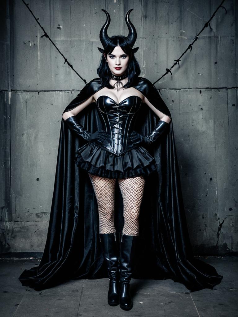 Adult female villain costume, 1girl, solo, horns, cape, pantyhose, gloves, black hair, fishnets, choker, fishnet pantyhose, corset, breasts, boots, full body, dress, goth fashion, looking at viewer