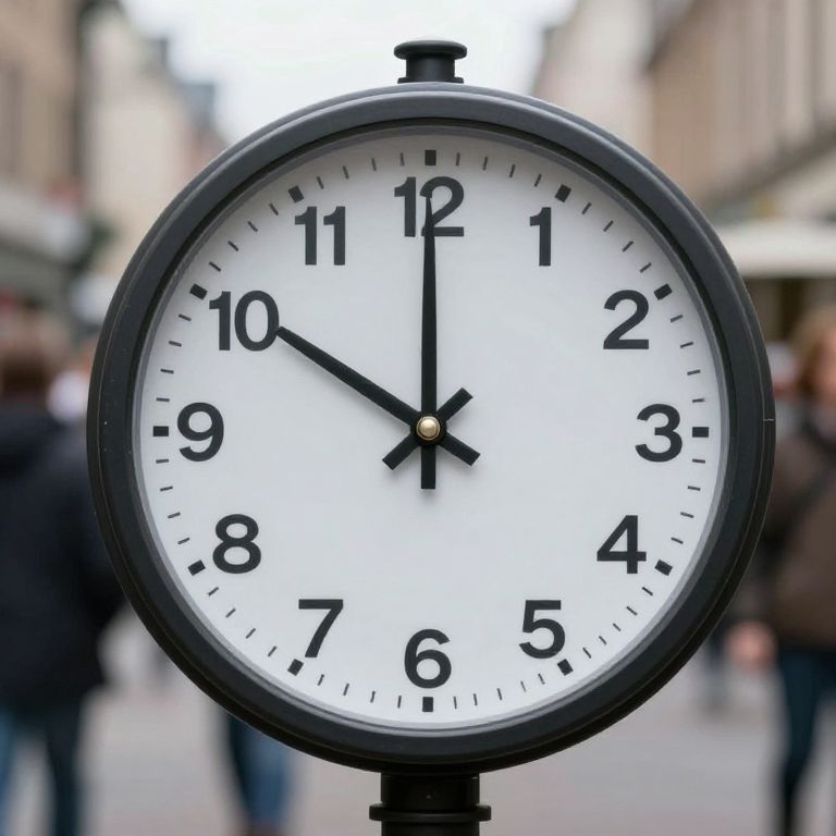 Photograph of a round, black-framed, analog clock with a white face and black numerals and hands, showing 10:09. The clock is centered in the image with a blurred urban background, including indistinct pedestrians and buildings. The clock has a simple, classic design, with black hour and minute hands and a black second hand. The background is slightly out of focus, emphasizing the clock's time and details. The clock is mounted on a black post in the middle of a street.