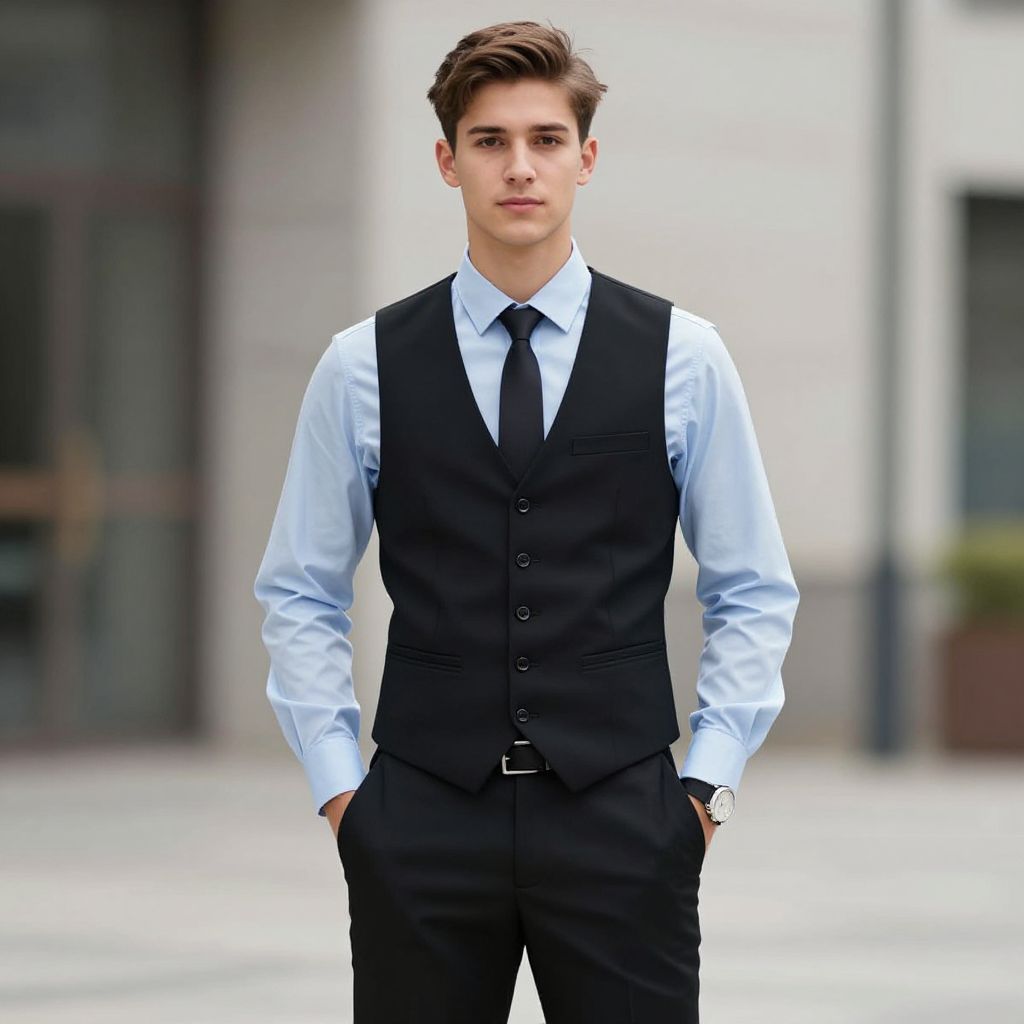 Casual business outfit, male focus, necktie, 1boy, wristwatch, watch, shirt, blurry background, hands in pockets, belt, blurry, pants, vest, realistic, black pants, blue shirt, outdoors, solo focus, brown hair, collared shirt, black necktie, black belt, looking at viewer
