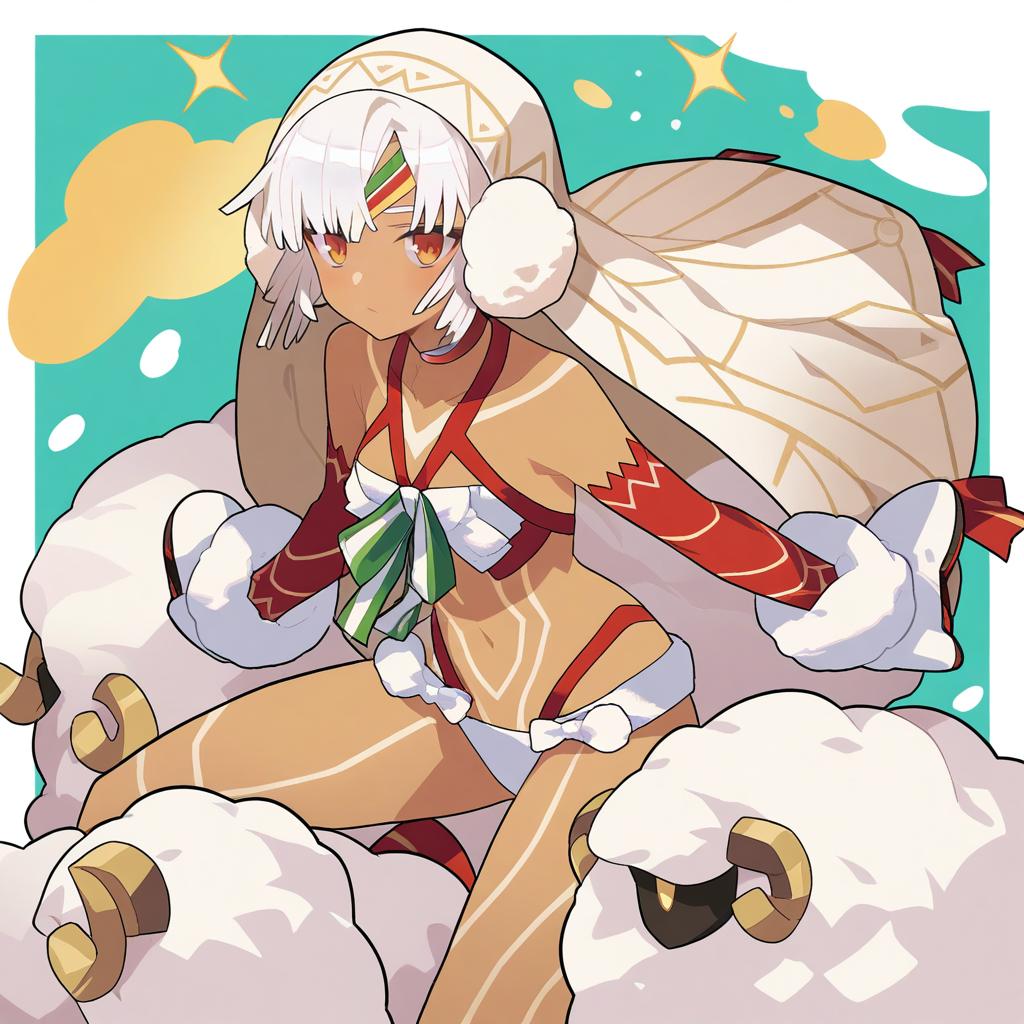 Altera the santa (fate), fate (series), 1girl, dark-skinned female, red eyes, short hair, white hair, small breasts, thighs, navel, full-body tattoo, collarbone, veil, bare shoulders, detached sleeves, choker, sheep, earmuffs, mittens, white mittens, by artist gomipomi, animagine