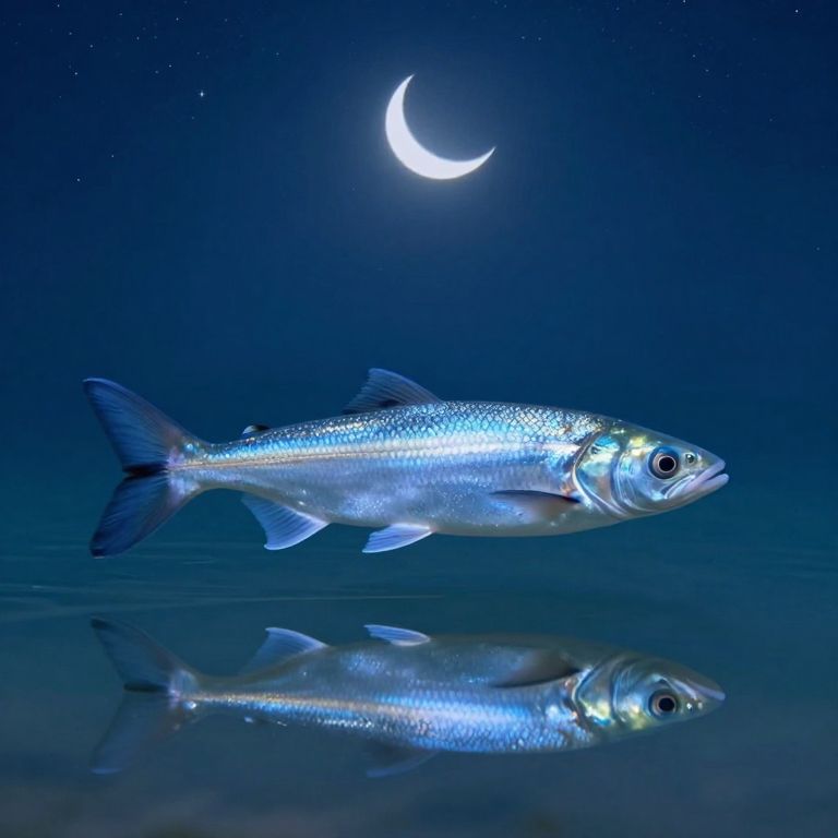 Digital illustration of a silver fish with a glowing, speckled scales, swimming horizontally in a reflective, dark blue water surface. The fish's reflection is clear below it. In the background, a crescent moon shines brightly in a starry night sky. The fish has a small, bright light near its eye, adding a futuristic touch. The overall color palette is dominated by shades of blue and silver, creating a mystical underwater scene.