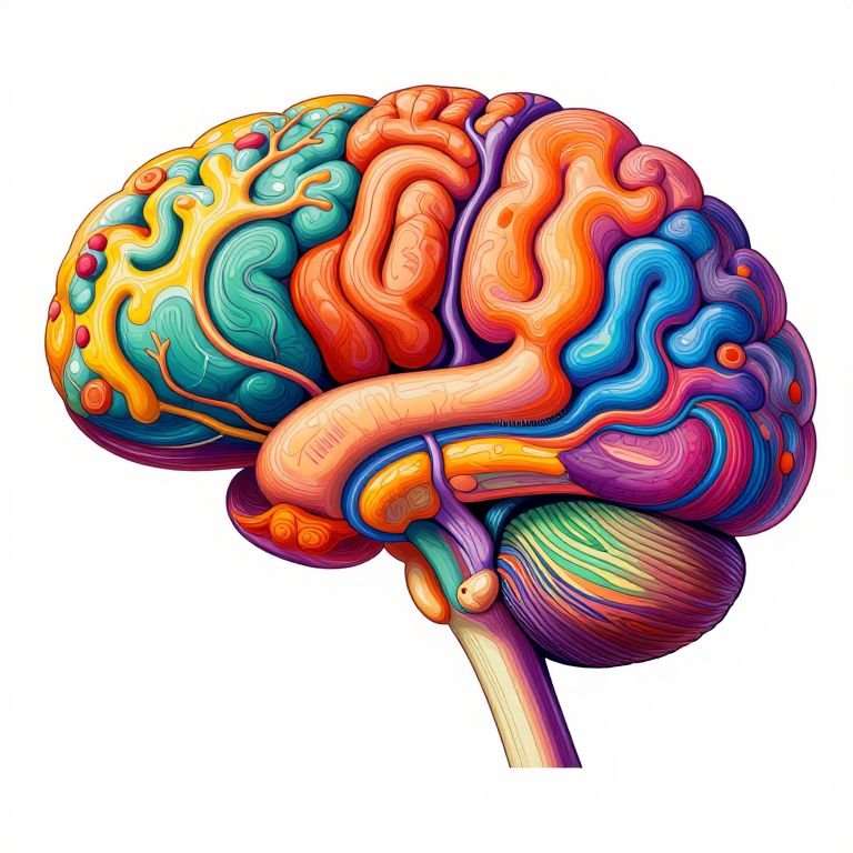 The image depicts a highly detailed and colorful cross-sectional view of a brain, showcasing its intricate anatomy in a psychedelic manner. The brain is divided into two halves, each rendered in a vibrant array of colors and textures. The left side features a mix of teal, orange, and yellow hues, with intricate patterns and textures that resemble neural networks and blood vessels. The right side is a blend of blue and orange, with swirling patterns that give the impression of a dynamic, active brain. The brainstem, located at the base, is depicted in a gradient of purple and green, with a series of wavy lines that add a sense of depth and movement. The overall composition is symmetrical, with the two halves of the brain mirroring each other, yet each with its unique color scheme and texture. The image is a striking representation of the brain's complexity, highlighting the interplay of colors, textures, and shapes that make up this remarkable organ.