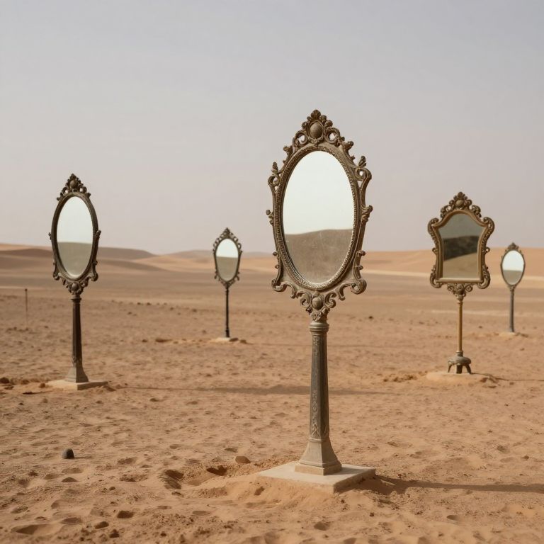 In a barren desert, a procession of ornate mirrors stands like sentinels, their reflective surfaces whispering echoes of forgotten memories, evoking a profound sense of solitude and introspection amidst the endless expanse.