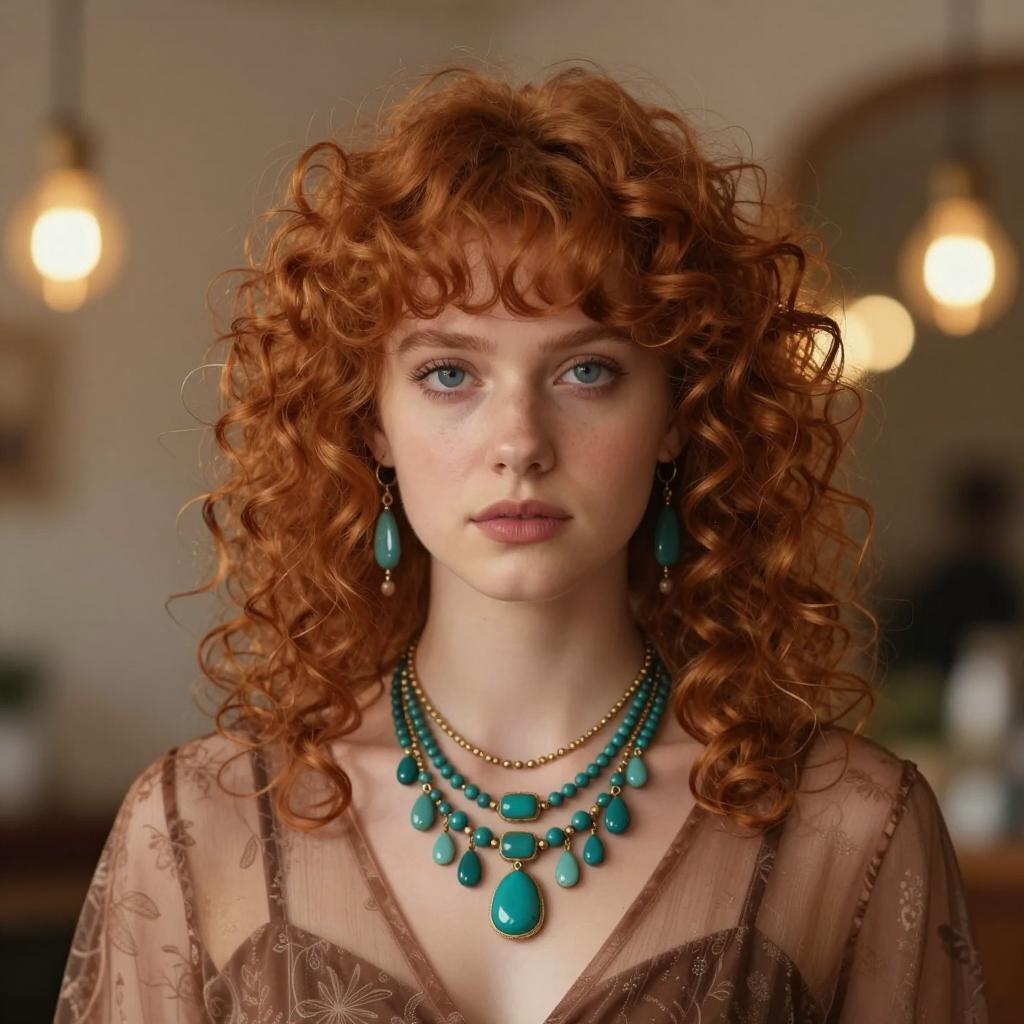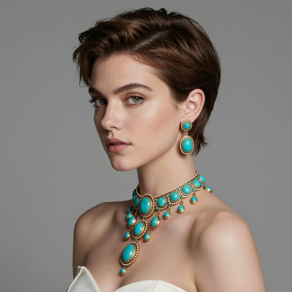 Portrait of Woman with Turquoise Jewelry and Pink Flowers