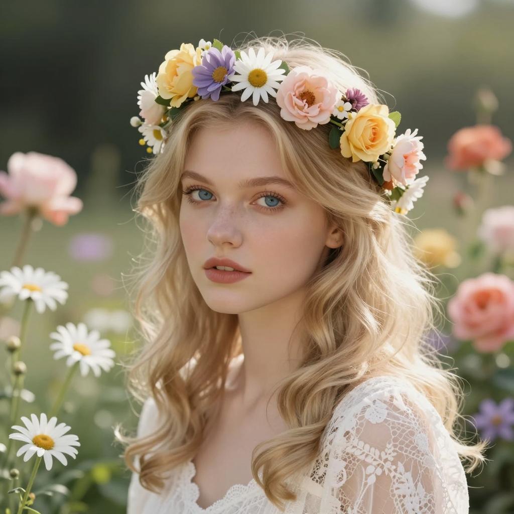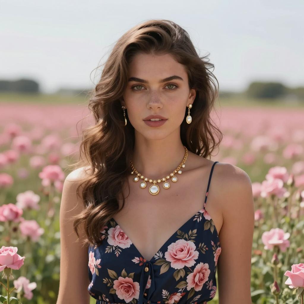 Close-up portrait of a young woman with light brown hair styled in a loose updo. She has blue eyes, slightly tanned skin, and a serious expression. She wears a gray strapless top with pink floral details and an ornate necklace with turquoise stones, matching turquoise earrings. The background is softly focused with pink flowers and sunlight, creating a vibrant and natural outdoor setting.