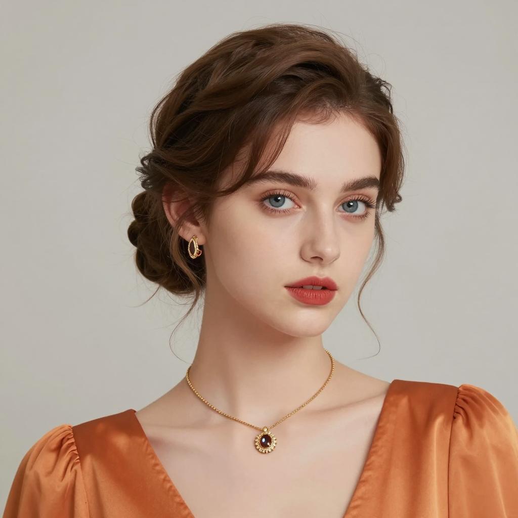 Hair locks cut, photo of beautiful young woman, realistic style, close-up, blue eyes, light brown hair in a loose updo, wearing gray strapless top with pink floral details, ornate necklace with turquoise gem, matching earrings, sunlight, soft focus background with pink flowers, serious expression, slightly tanned skin, outdoor setting, high quality, detailed, vibrant colors