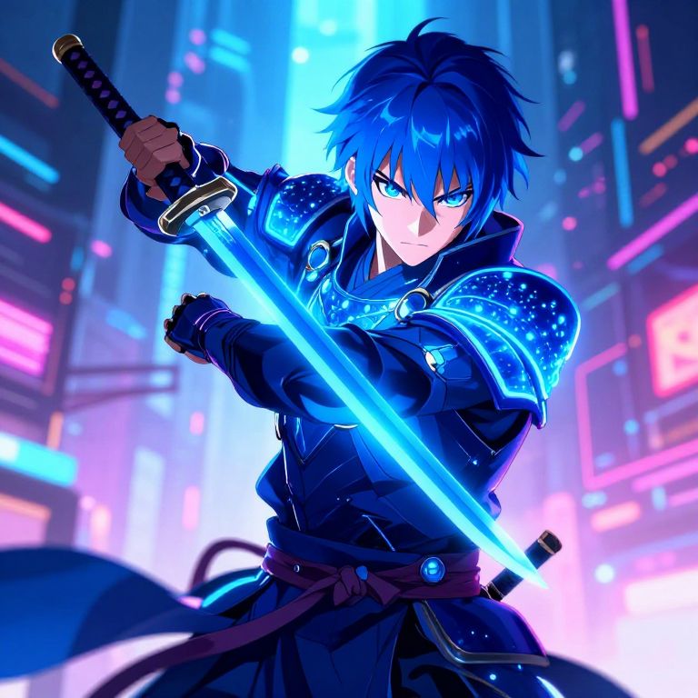 Character.ai anime style portrait of a futuristic samurai with glowing blue armor and neon katana, intense gaze, cyberpunk city background, vibrant colors, dynamic pose, detailed digital art
