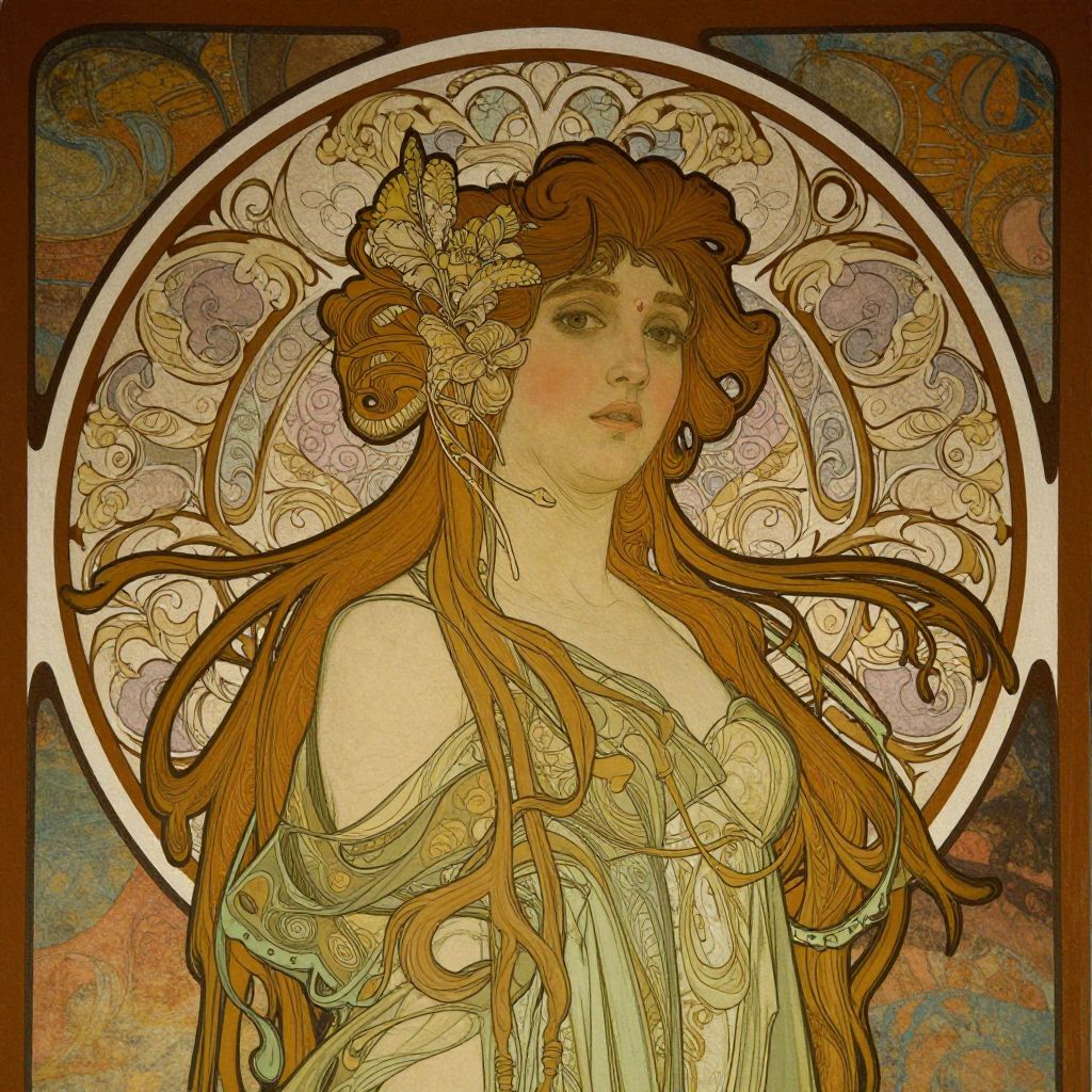 The image is a striking example of Art Nouveau style, characterized by its intricate and flowing lines, organic shapes, and a harmonious blend of natural and geometric elements. The central figure, a woman with long, wavy hair adorned with a delicate floral accessory, is framed within an elaborate, circular border that features ornate, swirling patterns. The background is a rich tapestry of warm, earthy tones, with a subtle, abstract design that complements the overall aesthetic. The color palette is dominated by shades of brown, gold, and green, creating a sense of depth and texture. The composition is balanced, with the woman's face positioned slightly off-center, drawing the viewer's eye through the intricate details of the border and background. The interplay of light and shadow adds a three-dimensional quality to the image, enhancing the sense of movement and fluidity. Overall, the image is a masterful display of Art Nouveau's emphasis on elegance, natural forms, and the seamless integration of art and design.