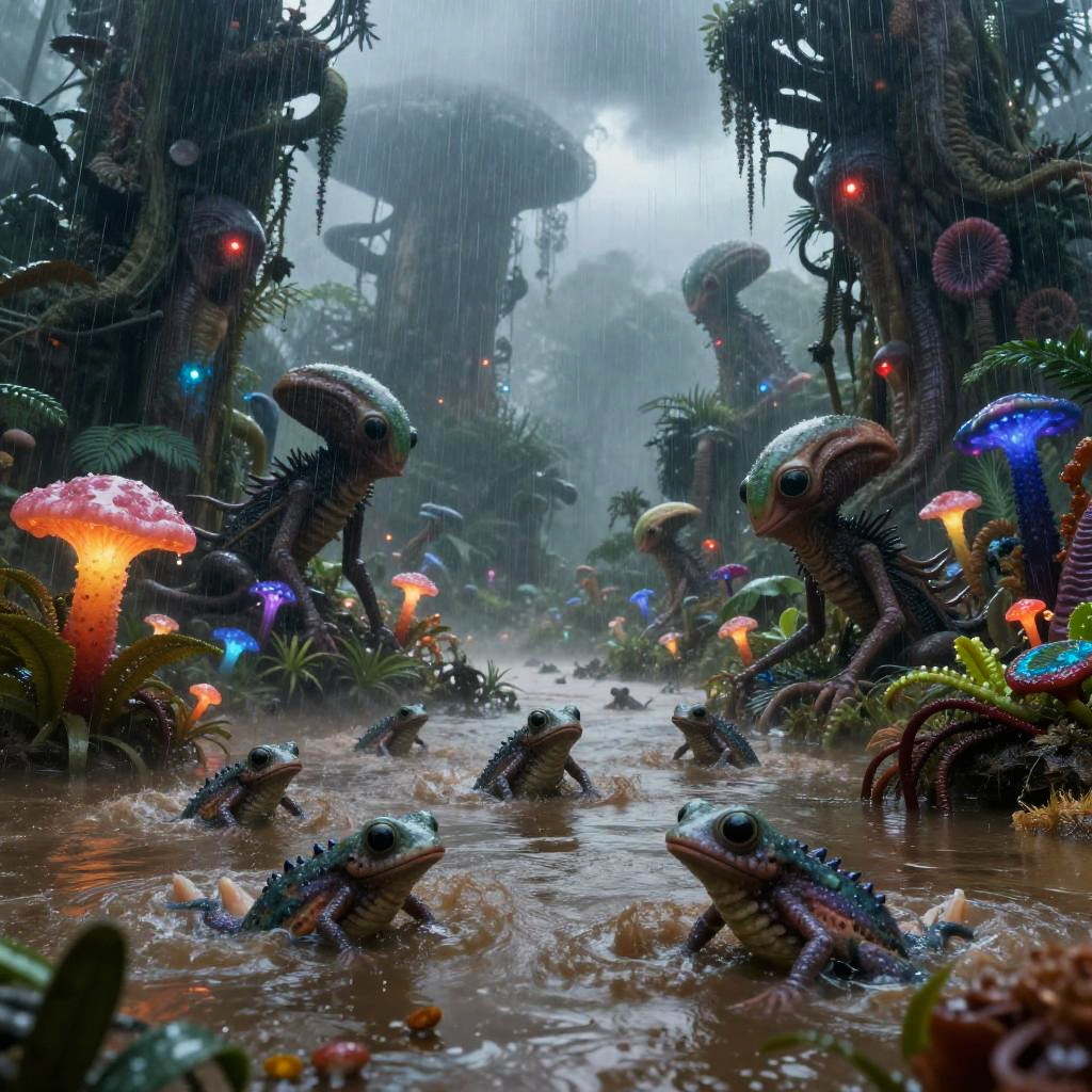 Surreal alien landscape featuring strange amphibious creatures with large eyes navigating muddy waters during heavy rain. The scenery includes towering, unusual plants and glowing bioluminescent mushrooms of multiple colors, under a dark and stormy sky, highlighting vivid colors and complex natural details.