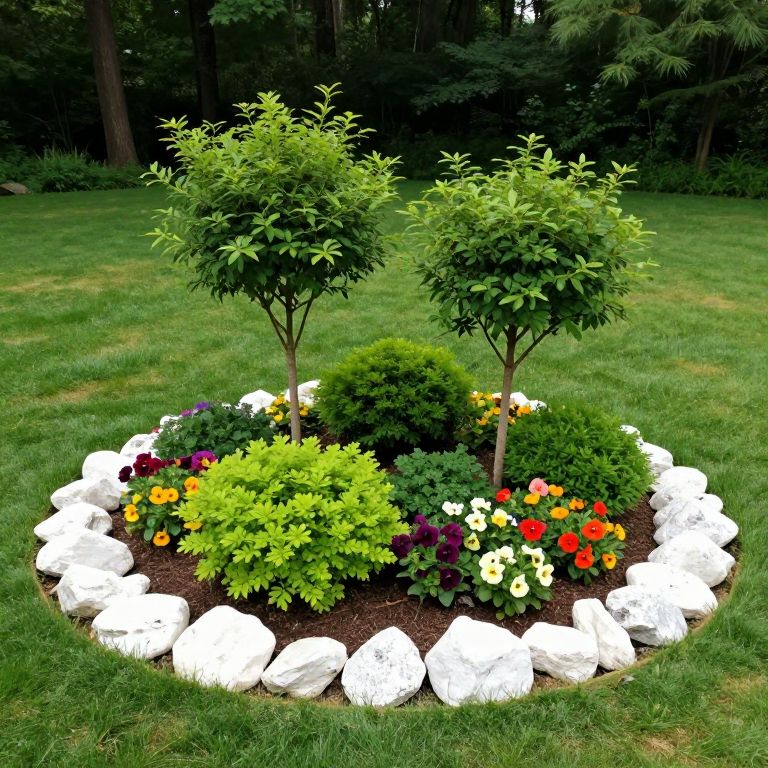 Circular garden bed surrounded by neatly arranged white rocks, featuring two young trees flanked by vibrant green shrubs and colorful perennials, set against a backdrop of lush lawn and forested area.