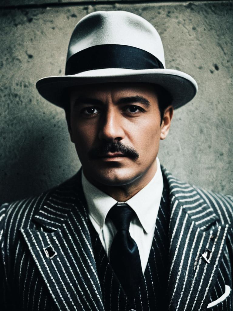 Man in Gangster Costume, photorealistic vintage cosplay portrait, cinematic realism