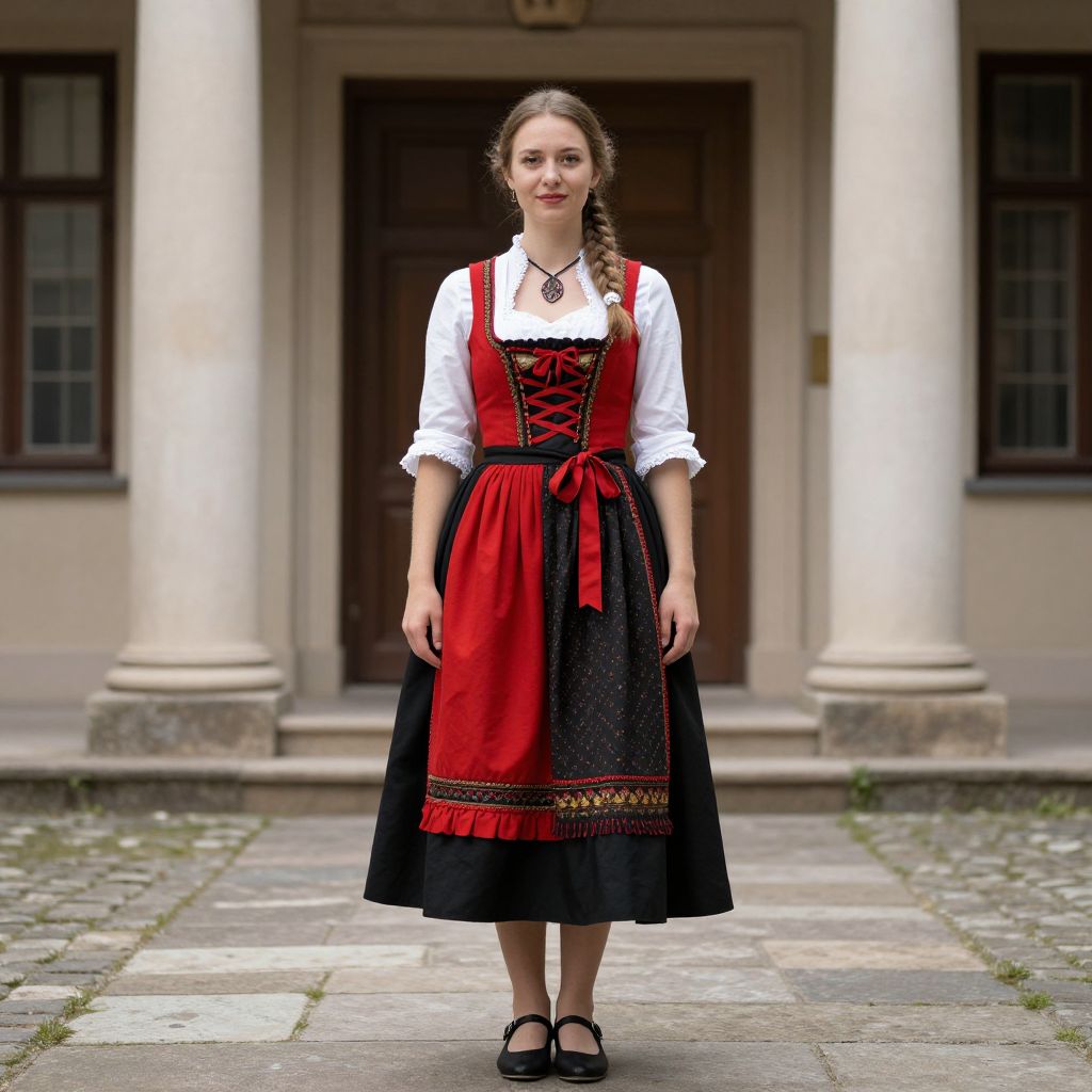 Photograph of a young woman standing in front of a classical building with columns. She has fair skin, brown hair in a side braid, and wears a traditional German outfit. Her dress features a red bodice with black lace trim, white sleeves, and a black skirt with red and gold embroidery at the hem. She has a black ribbon tied around her waist and wears black Mary Jane shoes. The background shows a cobblestone path and a wooden door with two small windows on either side. The image has a bright, natural light.