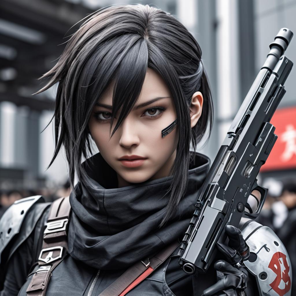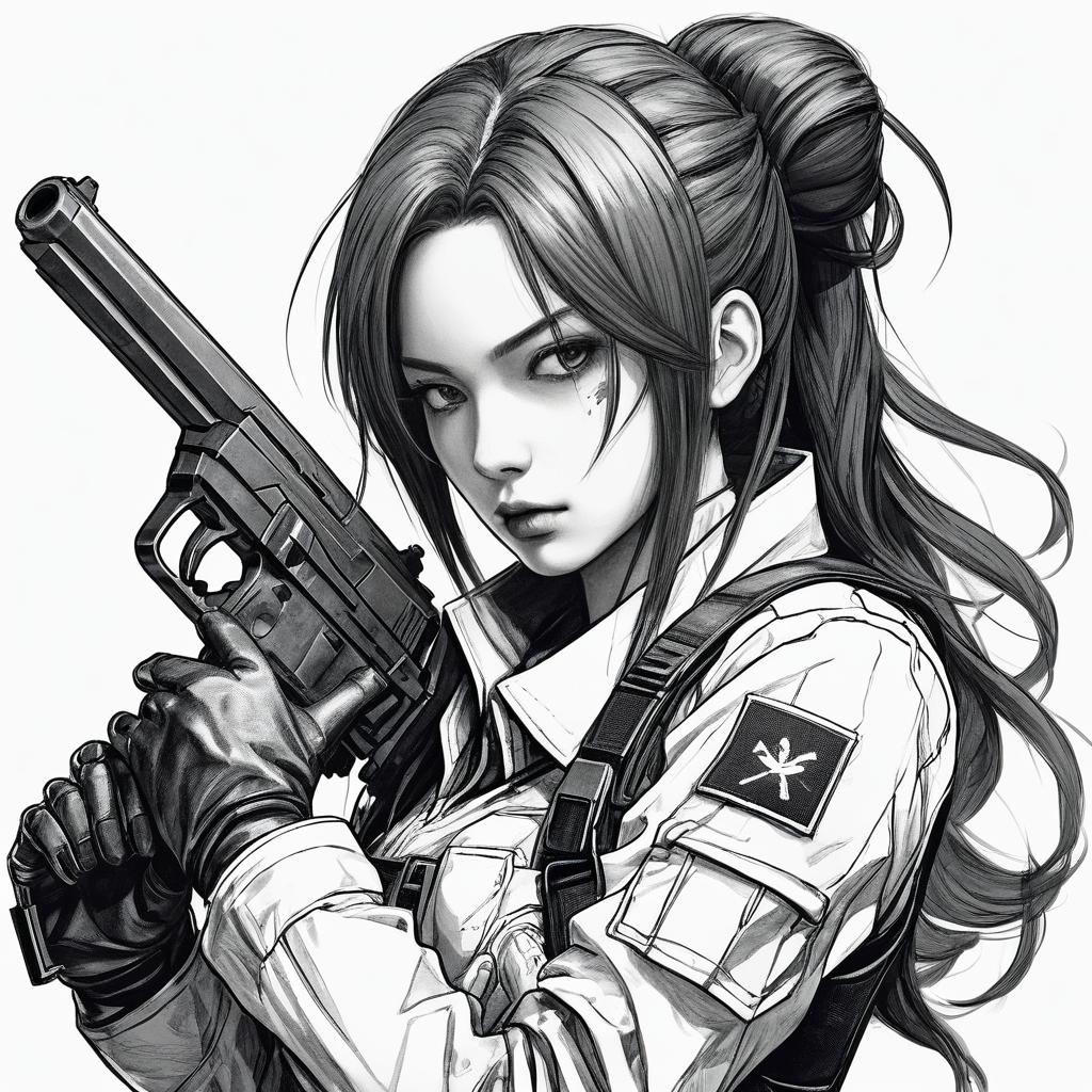 A drawing of a woman with a gun, dystopian concept art of comiket cosplay, close-up portrait of assassin.