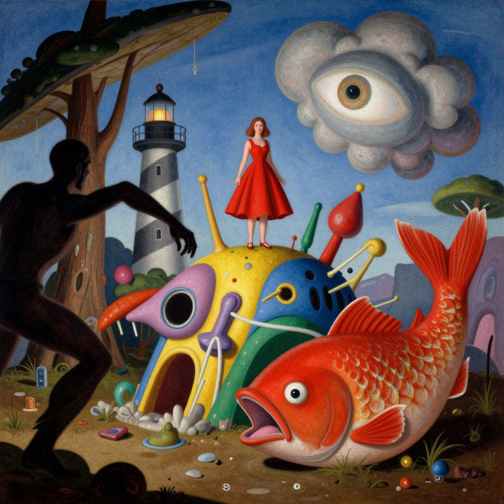 The image is a vibrant and surreal composition, featuring a chaotic yet harmonious blend of elements. Dominating the scene is a large, red fish with an open mouth, seemingly emerging from the ground. To the left, a dark, menacing figure with a long, curved arm reaches out, adding a sense of tension to the scene. In the center, a woman in a red dress stands atop a whimsical, colorful structure, her figure contrasting with the surrounding chaos. Above her, a large, abstract cloud-like shape with a glowing eye adds to the surreal atmosphere. The background is a mix of natural and industrial elements, with a lighthouse and a tree-like structure blending seamlessly with the sky. The overall composition is dynamic, with elements interacting in unpredictable ways, creating a sense of nostalgia and wonder. The colors are bold and varied, with reds, blues, greens, and yellows dominating the palette, while textures range from smooth and sleek to rough and organic. The scene is both chaotic and cohesive, with each element carefully placed to create a visually striking and thought-provoking image.