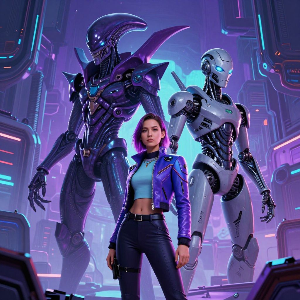 In the futuristic landscape of purple and turquoise hues, a young woman stands confidently in the foreground, her figure illuminated by the vibrant colors. She is clad in a sleek, futuristic jacket, her stance poised and ready. Behind her, two towering figures emerge, their forms a stark contrast to the organic human figure. The figure on the left, a menacing alien creature, is adorned with sharp, angular features and a menacing expression, its body a blend of dark purples and deep blues. To the right, a humanoid robot stands, its face a mask of cold, mechanical precision, its eyes glowing with an otherworldly light. The background is a chaotic mix of industrial structures and futuristic elements, their shapes and textures intermingling in a complex dance of light and shadow. The overall composition is dynamic, with the figures and structures arranged in a way that draws the viewer's eye across the scene, from the human figure in the foreground to the alien and robot in the background, creating a sense of depth and movement.