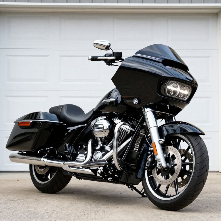 Stylish 2016 Harley-Davidson Road Glide® motorcycle parked prominently in front of a white garage door in Riverhead, New York, showcasing its sleek black finish, dual headlights, and polished chrome accents.