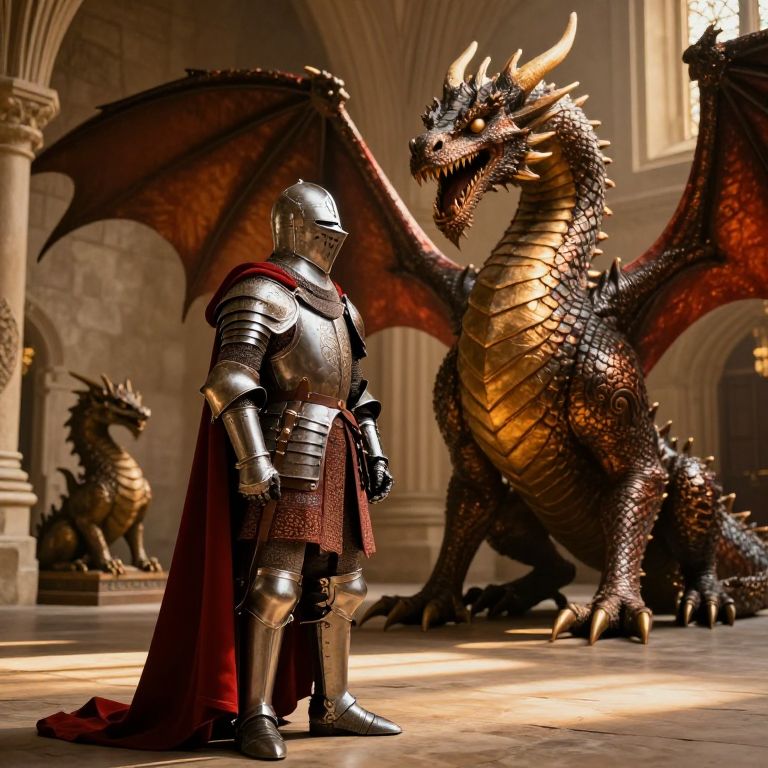In this highly detailed and realistic image, a medieval knight, clad in intricate armor and a flowing red cloak, stands confidently in a grand, ancient hall. The knight's helmet and armor are adorned with elaborate designs, reflecting the craftsmanship of a bygone era. To his right, a majestic dragon, with scales that shimmer under the light, looms imposingly, its massive body and fierce gaze suggesting a formidable opponent. The dragon's scales are intricately patterned, adding to its regal presence. In the background, a smaller, more delicate dragon sculpture sits quietly, its presence adding depth to the scene. The hall itself is bathed in warm, golden light, casting dramatic shadows that enhance the realism and texture of the scene. The interplay of light and shadow creates a sense of depth and volume, while the rich, earthy tones of the stone walls and floor add to the historical ambiance. The overall composition is dynamic, with the knight and dragon positioned in a way that suggests an imminent confrontation, their spatial relationship creating a sense of tension and anticipation. The image is a masterful blend of cinematic lighting and photographic detail, capturing the essence of a medieval fantasy world with remarkable realism.