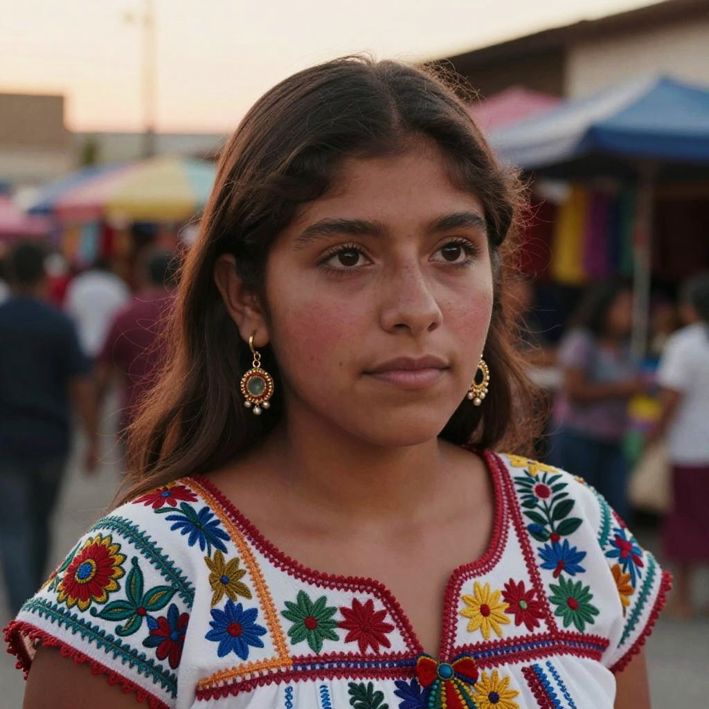 Latina with brown hair, vibrant street market background, colorful traditional clothing, warm sunset lighting, expressive eyes, detailed facial features, cinematic style