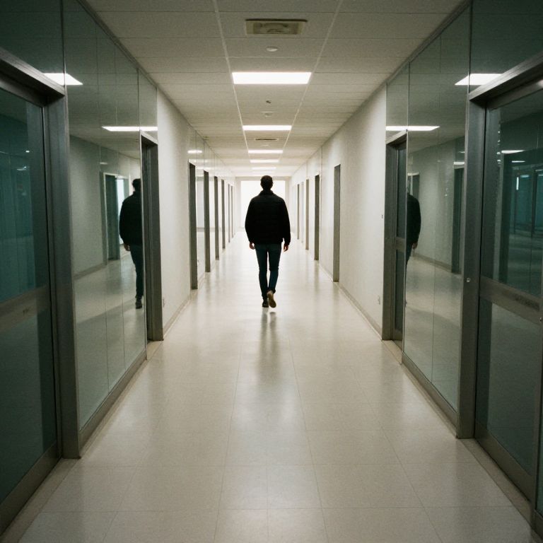 A solitary figure walks down an endless corridor lined with mirrors, casting a shadow that stretches infinitely forward, where light and reflection blur the boundaries between reality and illusion.