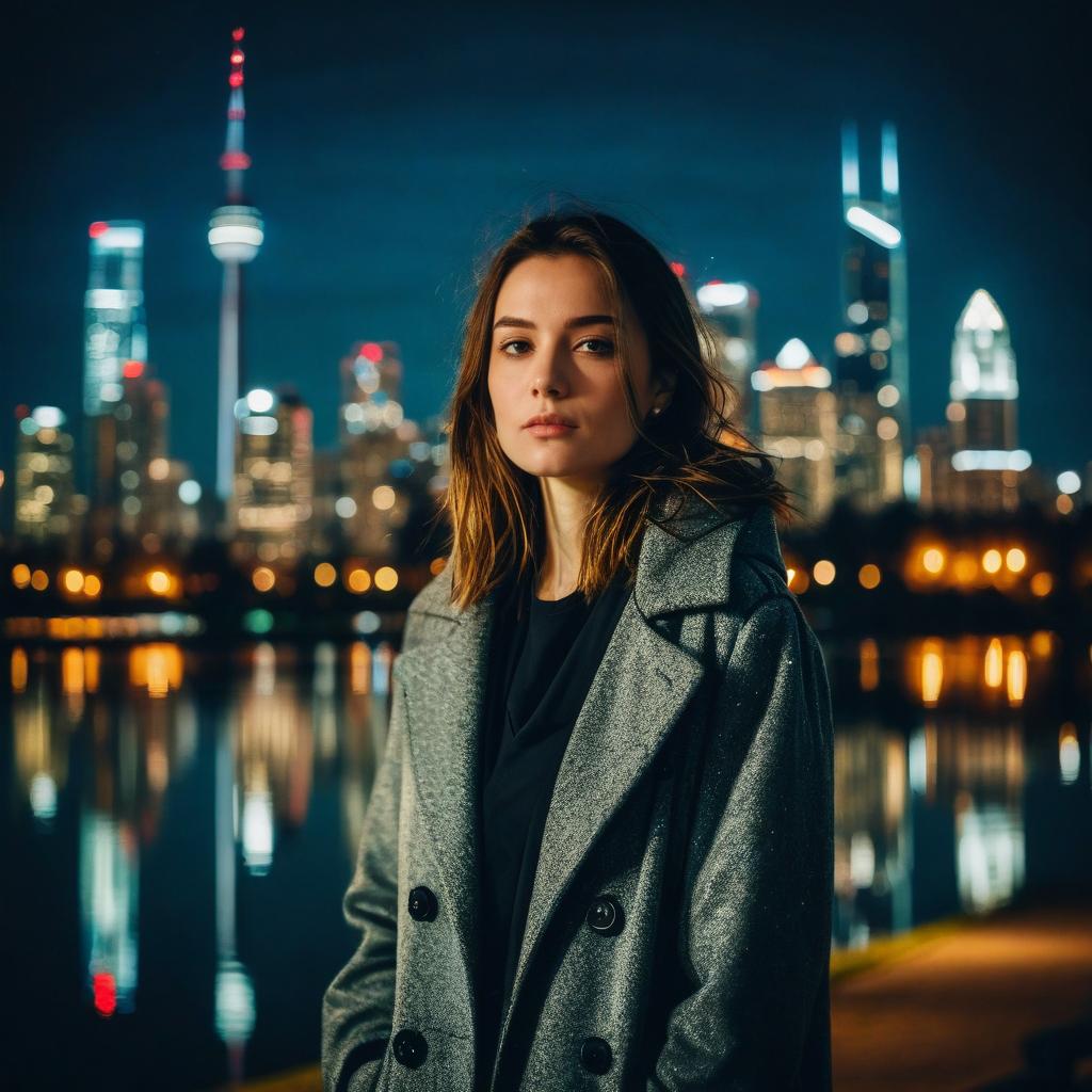 A young woman standing in a park at night with a city skyline in the background, soft warm bokeh lights from buildings and street lamps reflecting on water, cinematic and moody atmosphere, detailed facial expression, casual coat, urban night scene