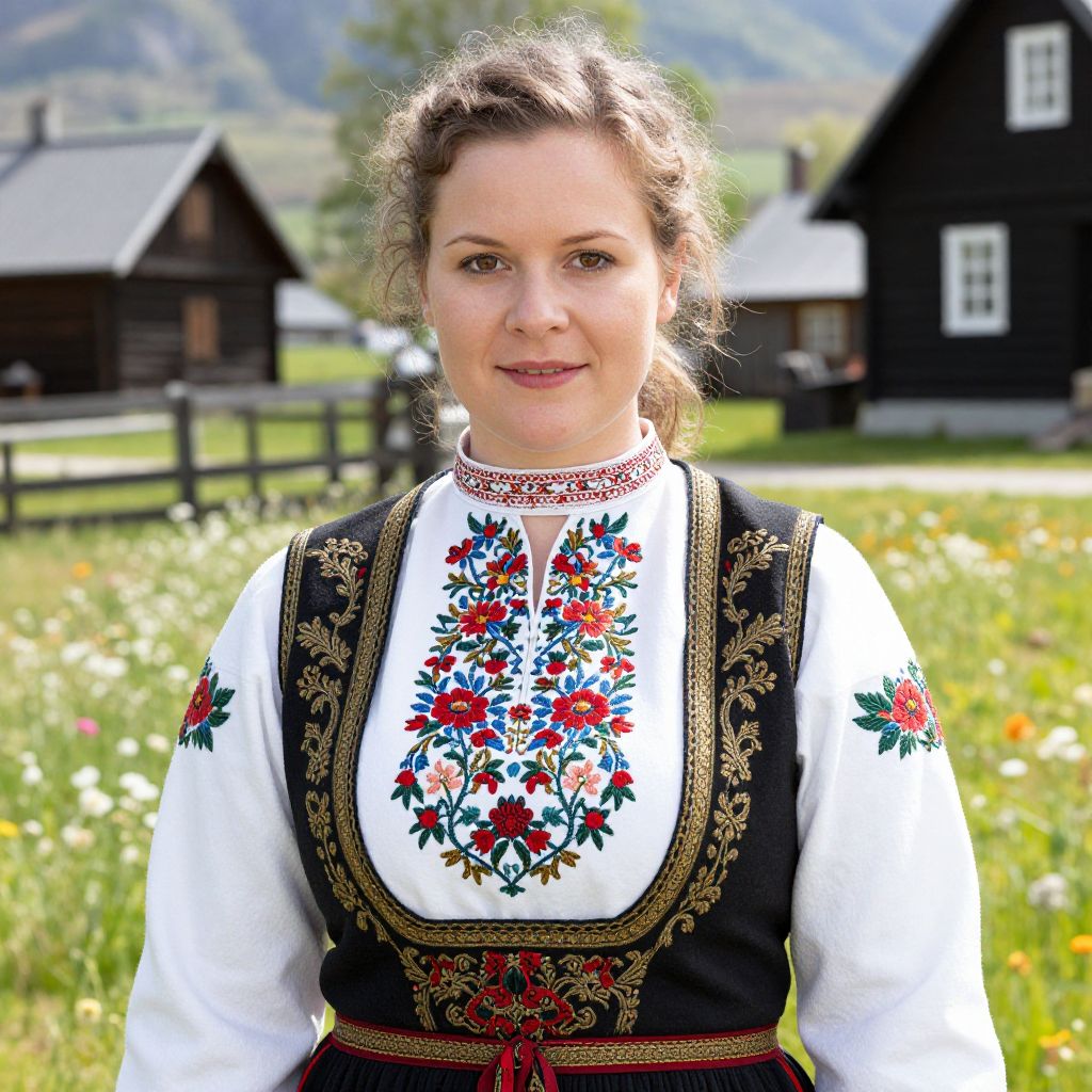 Photograph of a smiling Caucasian woman with light brown hair in traditional Nordic folk dress, standing in a sunlit meadow with black wooden houses in the