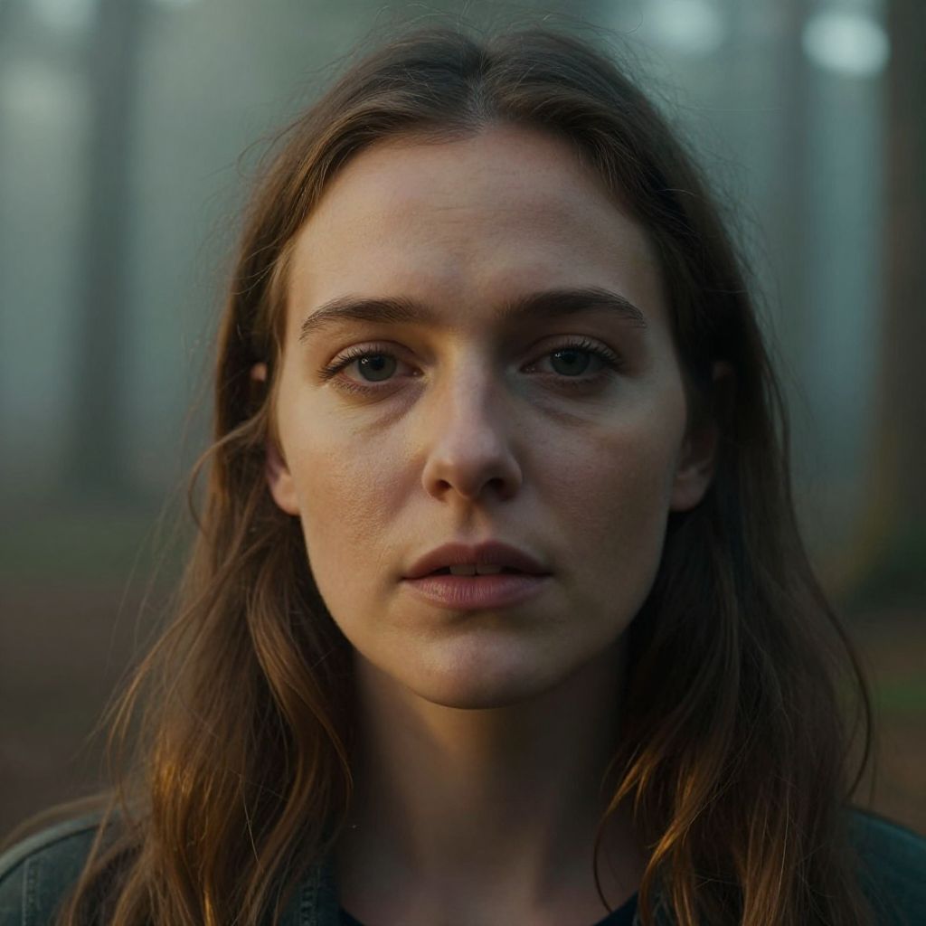 Cinematic colour grading prompt: A close-up of a woman's face in a misty forest, with a warm golden hue in the shadows and cool cyan highlights, creating emotional depth and mood through professional film grading techniques.