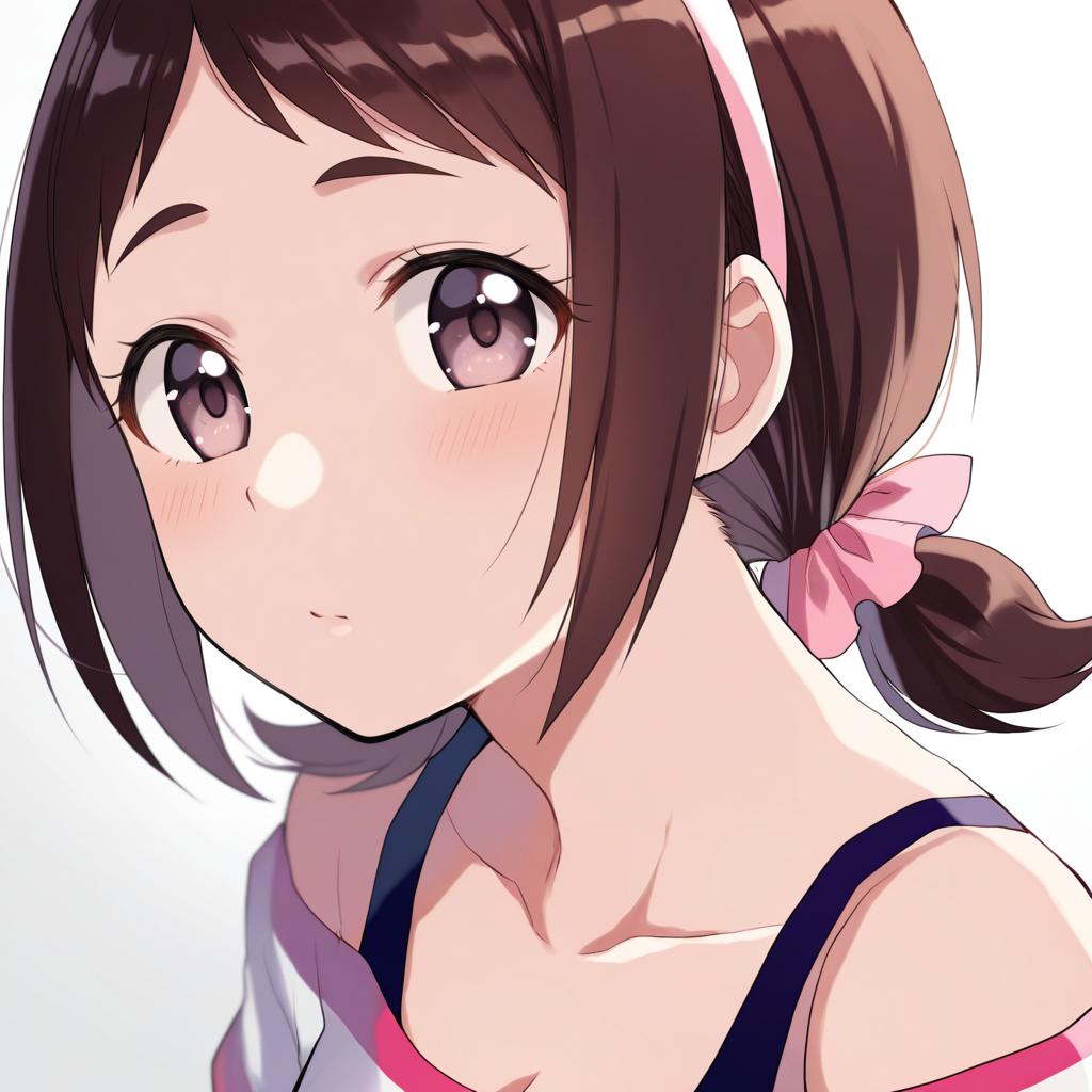 This digital anime-style drawing features a close-up of a young girl with large, shiny brown eyes and light skin. She has dark brown hair, partially tied back with a pink ribbon, and a few loose strands framing her face. She wears a pink headband and a black and pink top with a thin strap over her shoulder. The background is plain white, focusing attention on her expressive, slightly blushing face. The artist uses bright, bold colors and clean lines typical of modern anime art.
