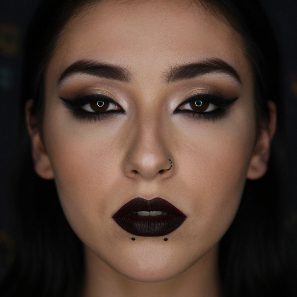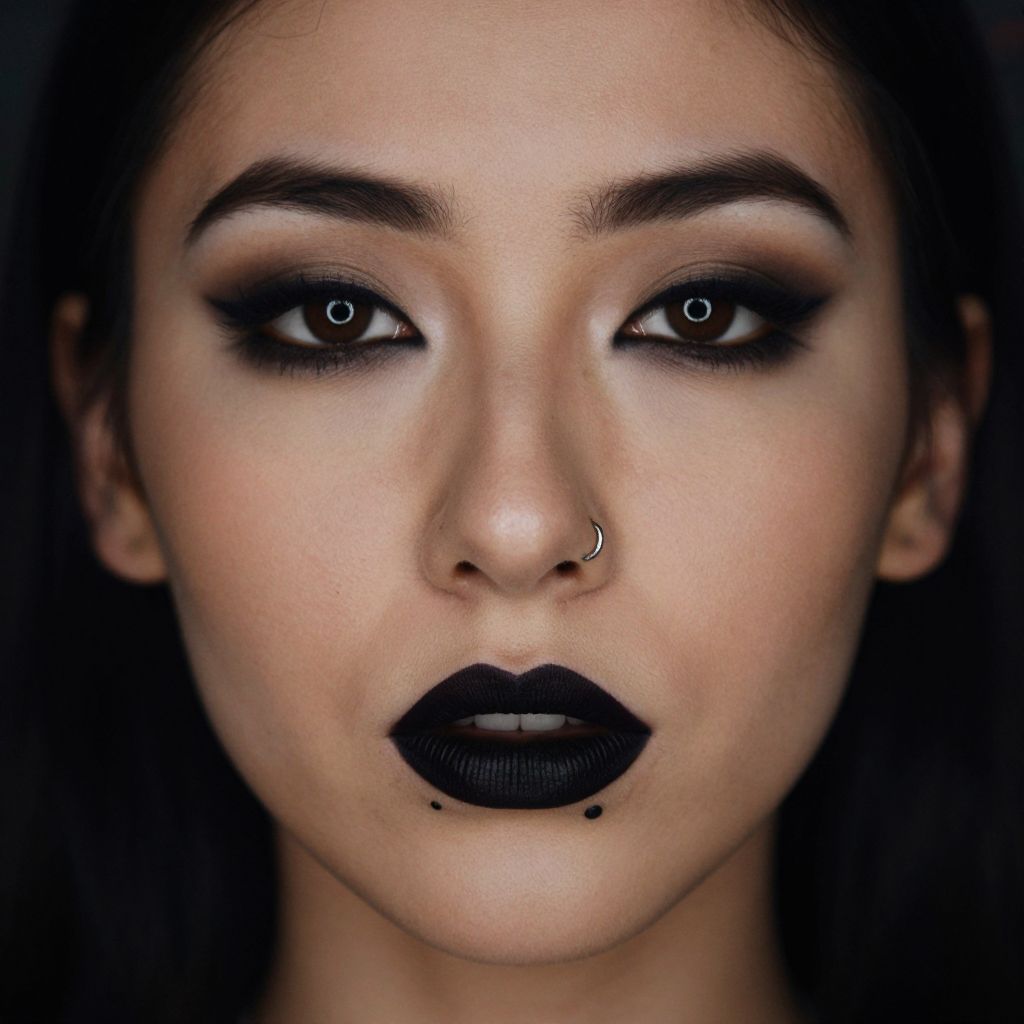This is a close-up, slightly darkened photograph of a woman with heavy, dramatic makeup. She has thick, dark eyebrows, heavily lined eyes with dark eyeliner, and dark, matte lipstick. She has a small silver nose ring and two black beauty marks below her lower lip. Her skin is light, and her expression is neutral. The background is blurred and dark, with some indistinct shapes and textures.