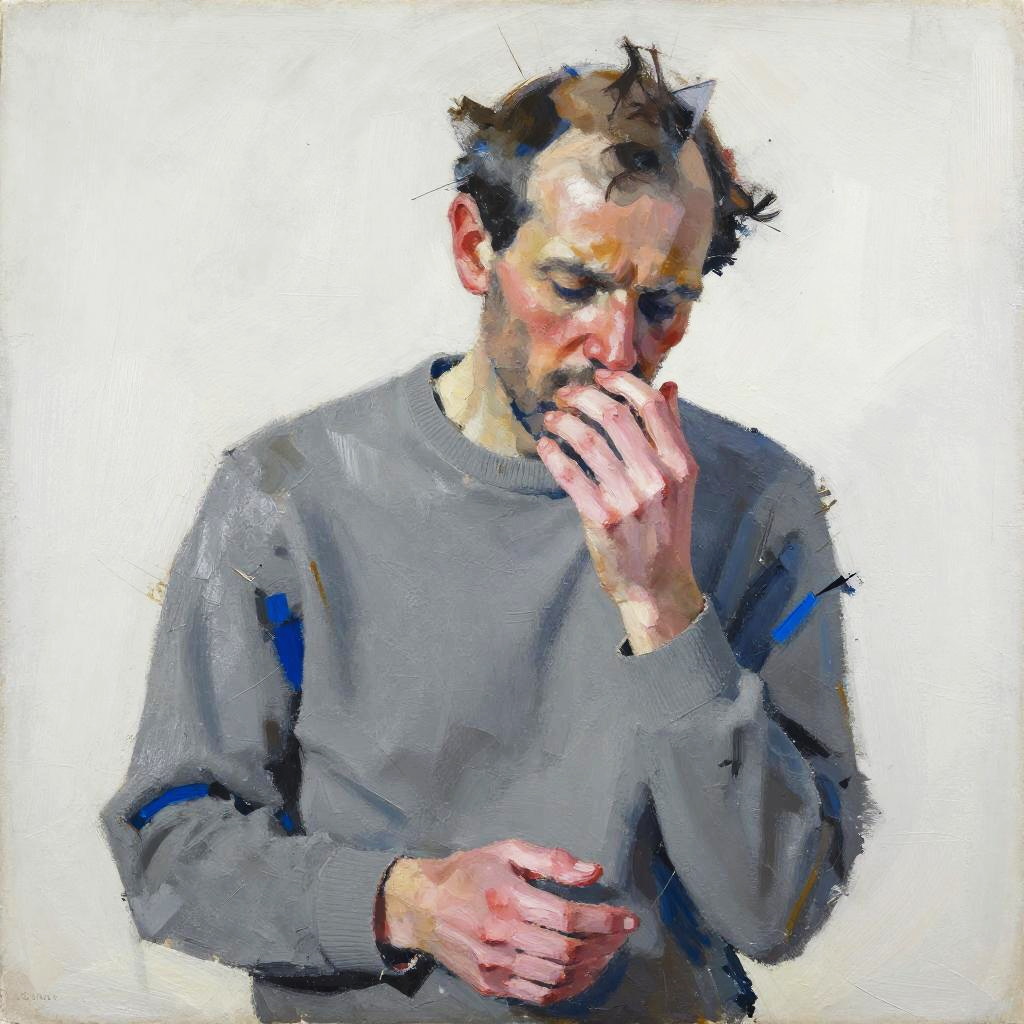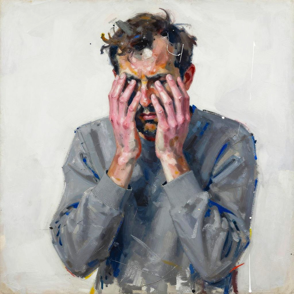 Expressionist semi-abstract portrait of shattered middle-aged man in slate gray sweater with fractured soft pink hands, rendered in neo-expressionist oil with layered palette-knife scrapes and ink stains, high-contrast bold colors, loose gestural strokes and textured paint ridges, minimal white negative space with asymmetrical crop, cobalt-shadow accents and suggestive contours, emotive brooding introspection laced with quiet fury, contemporary art poster vibe, painterly chaos with subtle drips, unresolved edges, luminous highlights.