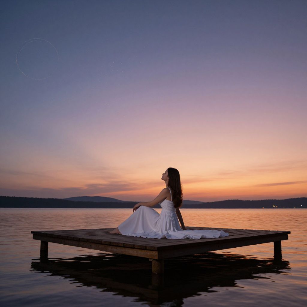 Silhouetted figures stand atop a towering stone bridge as a lone woman walks barefoot along a narrow pathway below, her shadow stretching toward the radiant sunset that casts golden hues over the misty waters and distant forested hills.