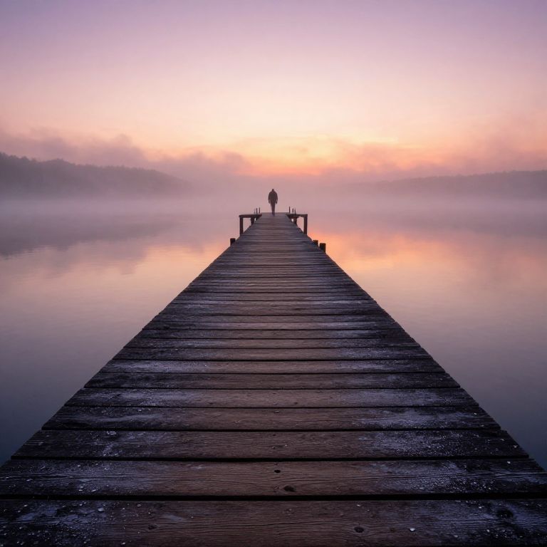 Photograph of a serene sunset over a calm lake. Two silhouetted figures stand on a stone bridge that extends into the water. The larger figure is on the bridge's edge, while the smaller figure is closer to the shore. The sun is just below the horizon, casting a golden glow and long shadows. Mist rises from the water, adding a ethereal quality. The bridge has an archway on the left, with textured stone visible in the shadows. The sky is clear, with a gradient from orange near the horizon to blue at the top.