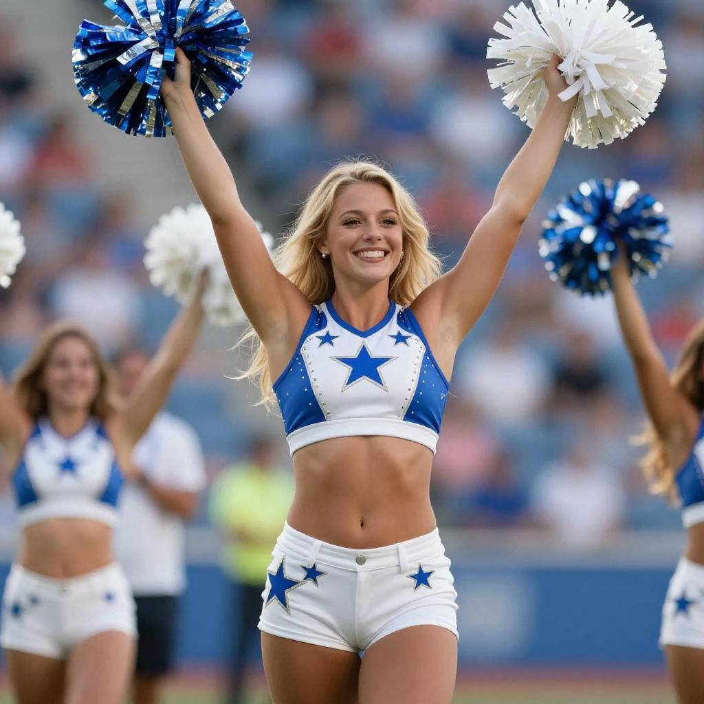 Photograph of a blonde woman with wavy hair, wearing a red and gold embroidered hat, white tank top with "USA" and a flag emblem, and red face paint in the shape of a star. She holds a flag and smiles, surrounded by a blurred crowd in a stadium.