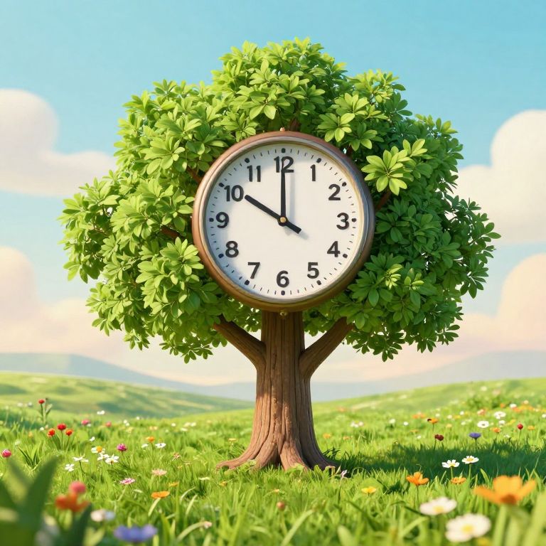 A whimsical tree stands tall in a vibrant meadow, its trunk seamlessly integrating a large, round clock face that displays the time as 10:10, surrounded by lush green foliage and dotted with wildflowers beneath a serene sky.