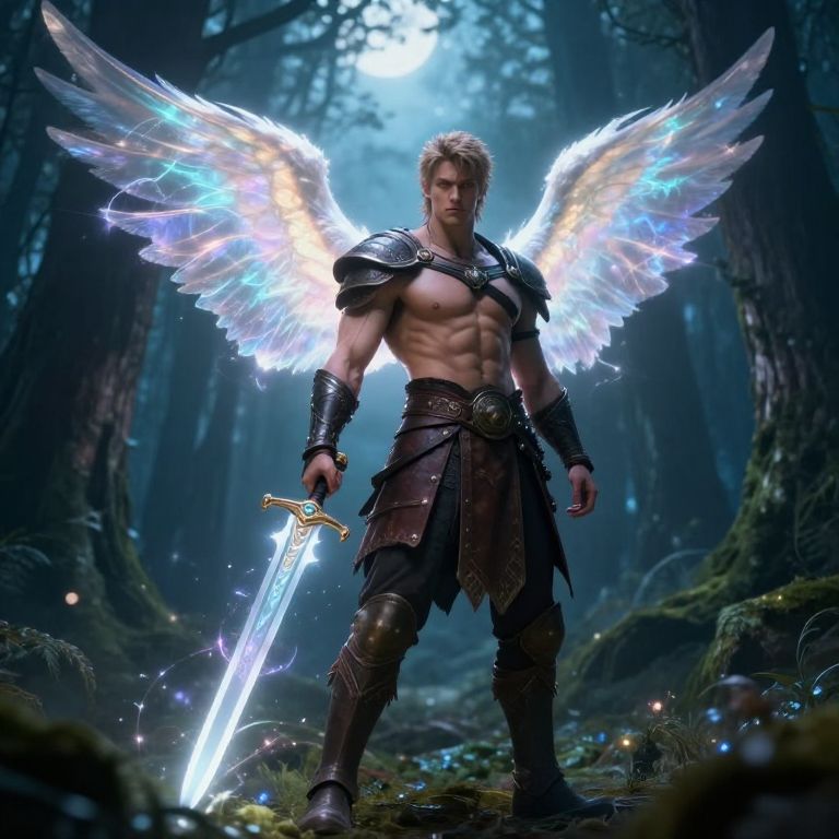 Warrior male fairy standing strong on a mystical forest battlefield, muscular physique with iridescent wings glowing in moonlight, dressed in ancient leather armor, holding a glowing sword, ethereal magical aura surrounding him, fantasy art style.