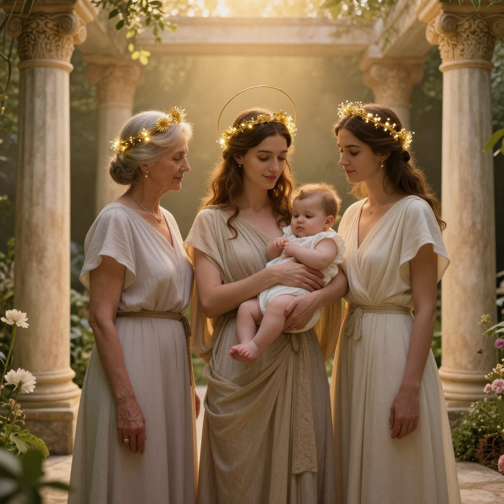In a serene Greek garden with ancient columns, three sisters stand together, their golden circlets shimmering with fairy lights. The woman in the center, a woman of 25, holds a baby girl in her arms, her expression one of gentle protection. To her left, a 60-year-old woman stands, her presence both maternal and wise. Their attire, a soft, flowing fabric, complements the ethereal atmosphere. The garden is bathed in a warm, soft yellow light, creating a magical and tranquil ambiance. The intricate details of the columns, the delicate flowers, and the fine golden circle over their heads add to the richness of the scene. The overall composition is balanced, with the sisters aligned in a harmonious group, their spatial relationships creating a sense of unity and familial bond. The digital painting captures the essence of a timeless moment, with the cinematic lighting and photo-realistic details bringing the scene to life.