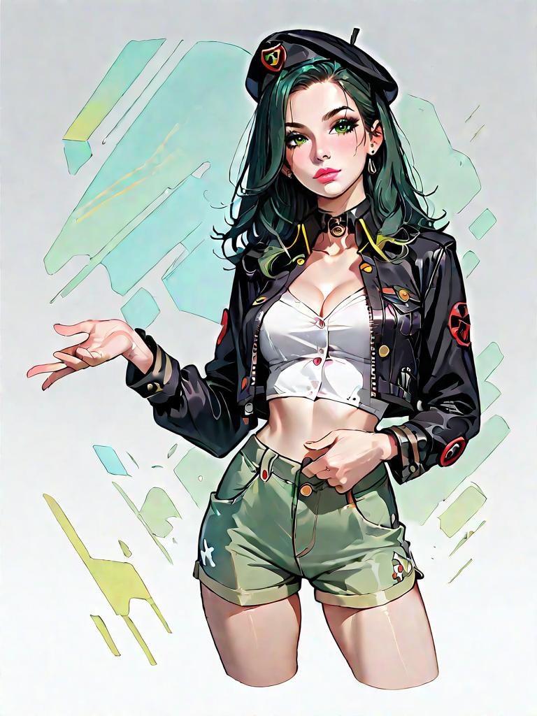 1girl, source_comics, realistic face, full body shot, Woman, military-inspired, cropped jacket with sharp collar, button-down front, chest pockets, long sleeves with buttoned cuffs, olive green, matched with high-waisted shorts in same color and fabric, button and zipper closure, side pockets, short hemline, accessories include a glossy patent leather beret in black, photo studio background