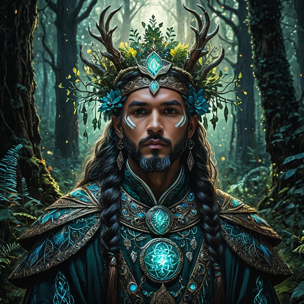 Closeup portrait of a mystical forest healer standing in an ancient enchanted woodland. She is wearing an ornate outfit adorned with intricate turquoise and gold embroidery, and a crown featuring large antlers and foliage. The healer holds a glowing magical orb, surrounded by lush green forest with dramatic lighting enhancing the fantasy atmosphere.