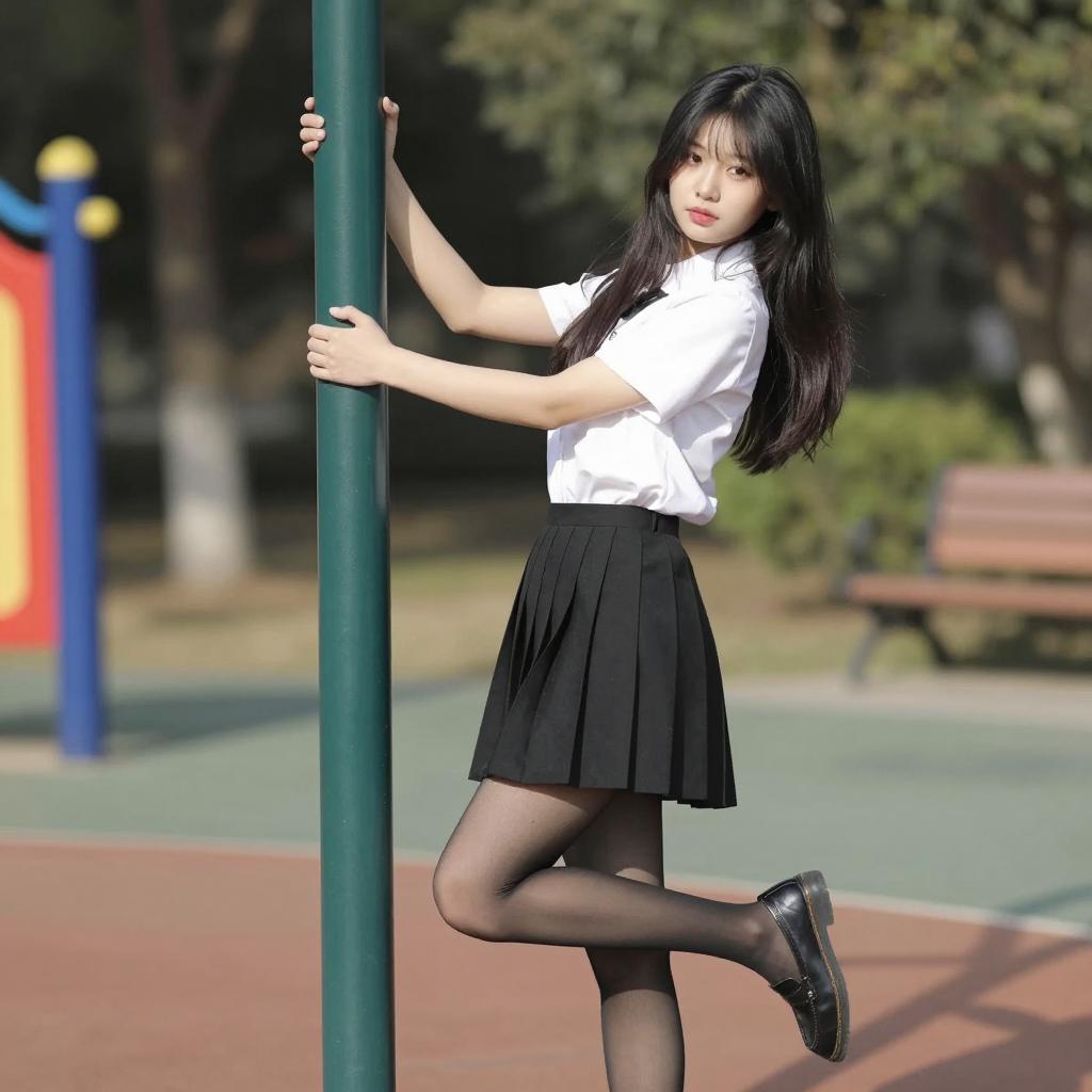Young Asian woman with long black hair, white short-sleeve blouse, black pleated skirt, black tights, and black loafers. She is climbing a green metal pole in a park, one leg raised, grasping the pole with both hands. Background includes blurry park elements and a blue and red object on the left. Sunlight highlights her figure. She has a neutral expression. Photographic style.