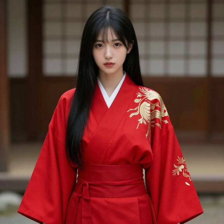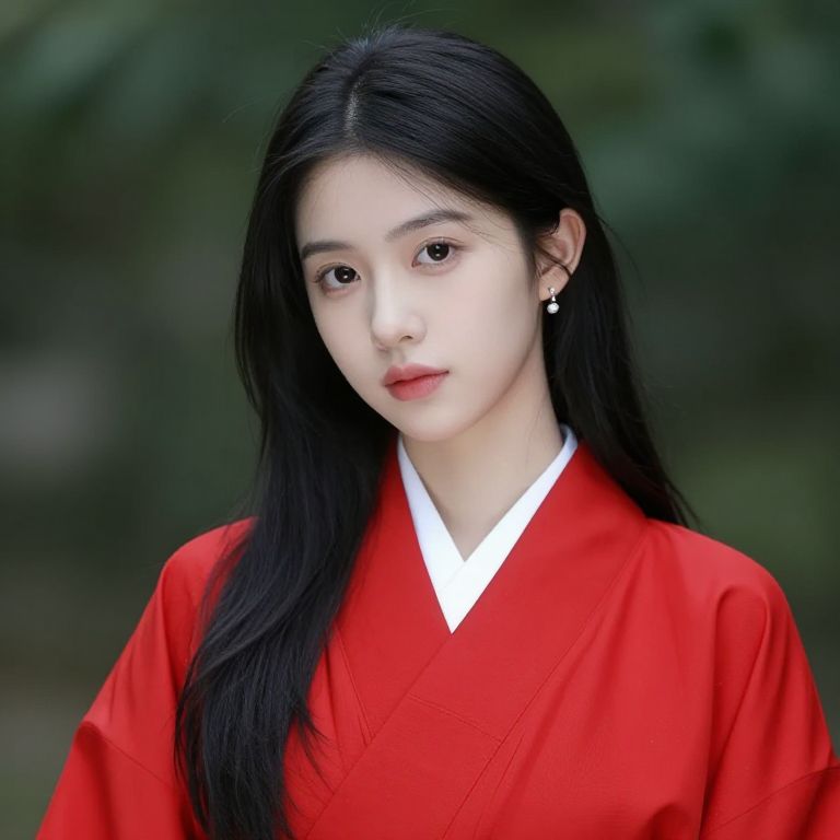 Asian girl with long black hair wearing a red kimono with a white collar and a pair of earrings.
