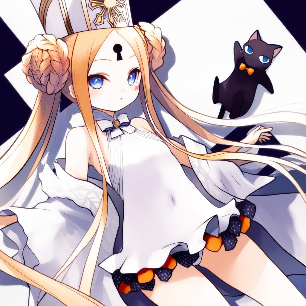 Abigail williams (swimsuit foreigner) (second ascension) (fate), fate/grand order, 1girl, blue eyes, blonde hair, very long hair, parted bangs, sidelocks, double bun, twintails, braided bun, small breasts, thighs, covered navel, white one-piece swimsuit, dress swimsuit, white headwear, bare shoulders, orange bow, black bow, multiple bows, forehead, black cat, keyhole, mitre, white hat, by artist yume shokunin, animagine