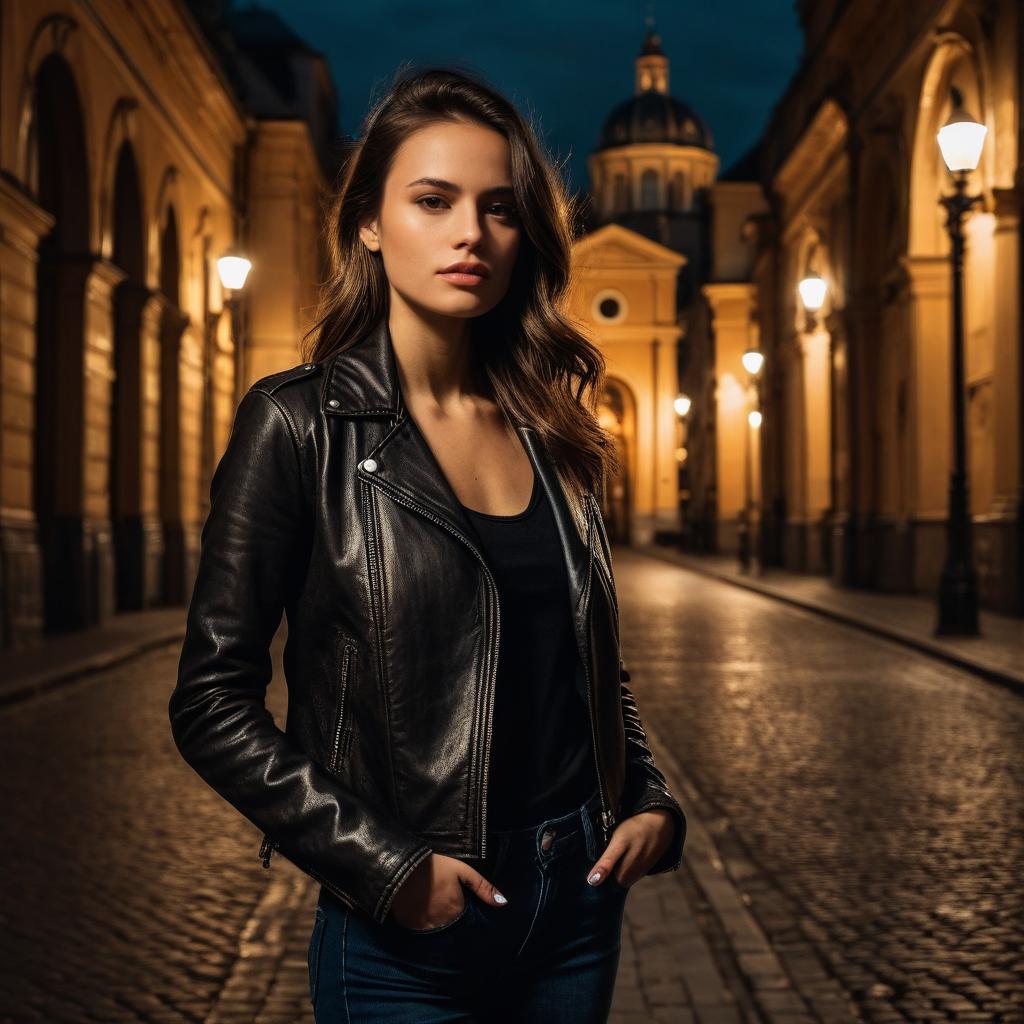 A young woman stands confidently on a cobblestone urban street at night, illuminated by warm street lighting. She is wearing a black leather jacket over a white top and dark skinny jeans. The background features classic European architecture with beige and brown building facades and arched doorways, creating a moody, atmospheric scene.