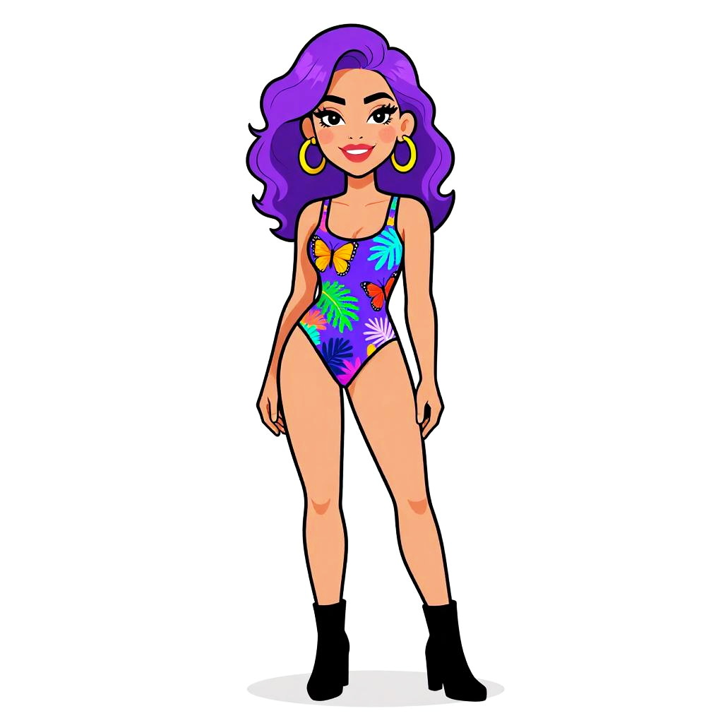 Digital illustration of a smiling woman with purple hair, wearing a striped black, white, yellow, and pink one-piece swimsuit. White background.